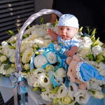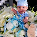White rose - 50 шт. Eustoma white - 50 шт. wicker basket - 1 шт. eucalyptus mix - 20 шт. children's toy - 2 шт.