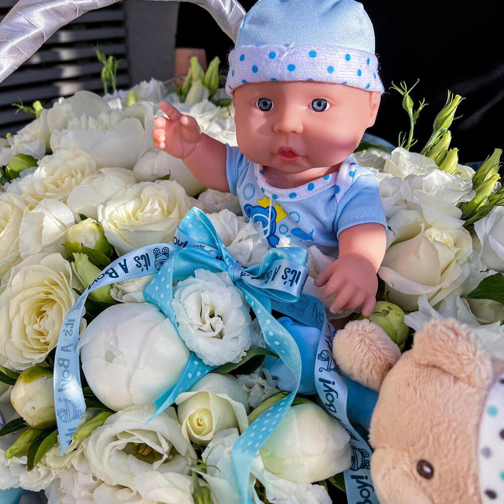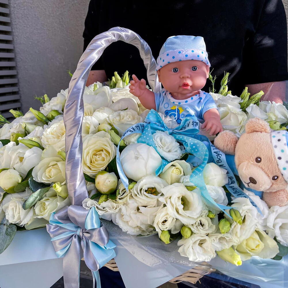 White rose - 50 шт. Eustoma white - 50 шт. wicker basket - 1 шт. eucalyptus mix - 20 шт. children's toy - 2 шт.
