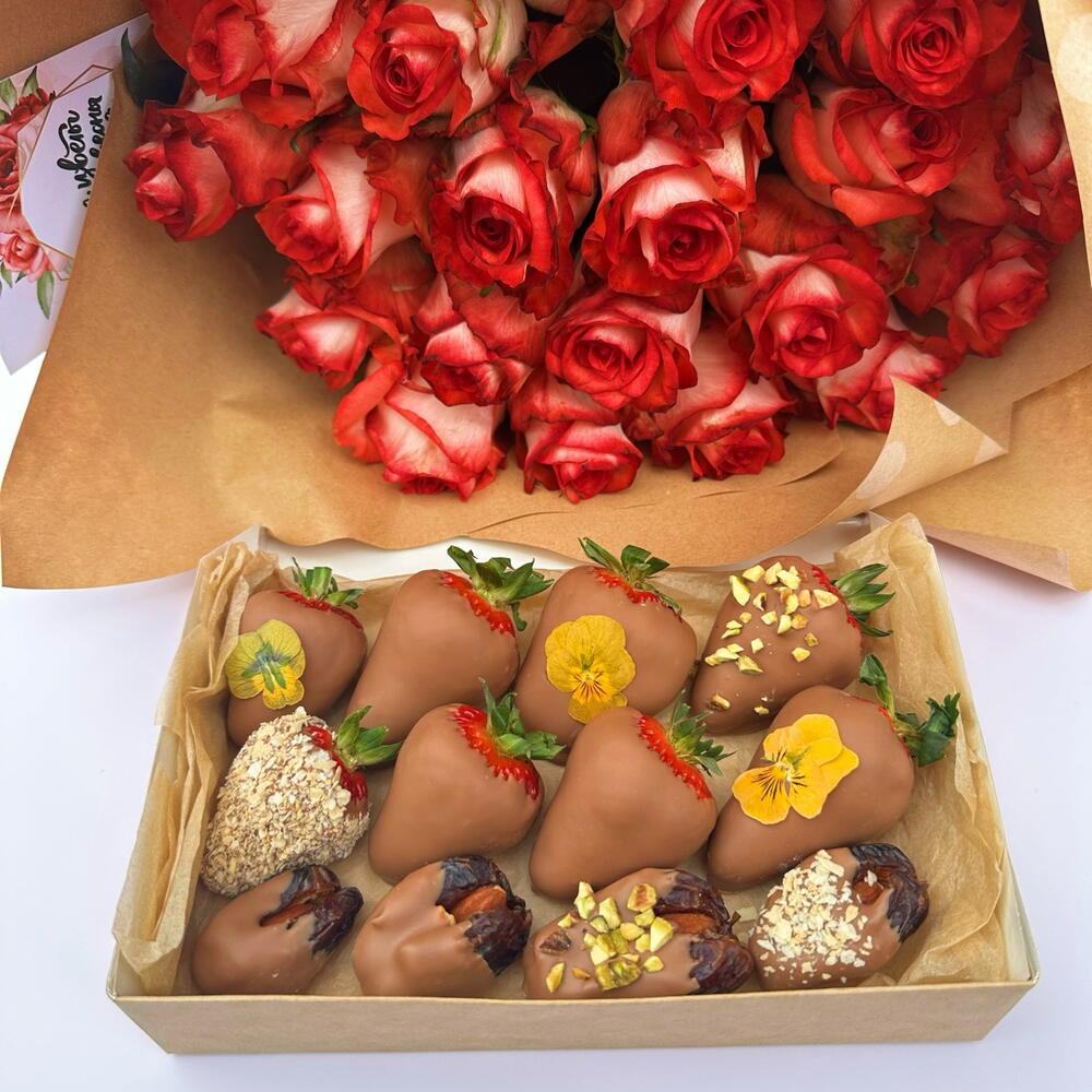 fresh rose - 23 шт. fresh strawberries in belgian chocolate - 8 шт. dates in belgian chocolate - 4 шт.