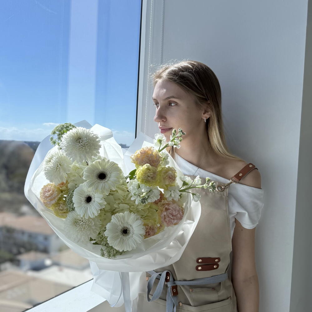 Снежный сад - герберы, эустомы, хризантемы, гортензия, калина, шток