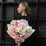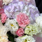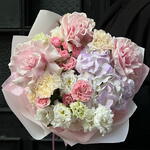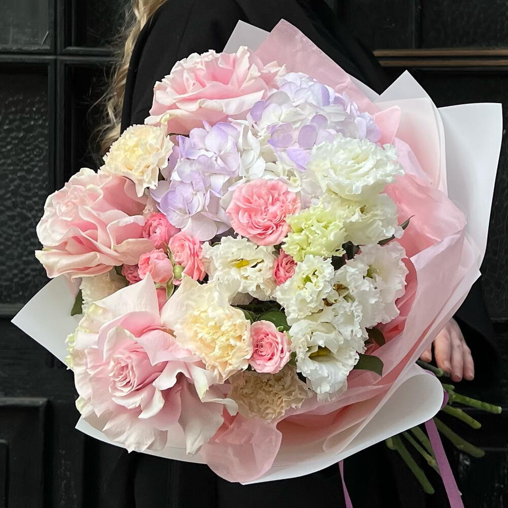 Эустома - 3 шт. Spray rose - 2 шт. hortensia - 1 шт. rose - 3 шт. dianthus - 3 шт.