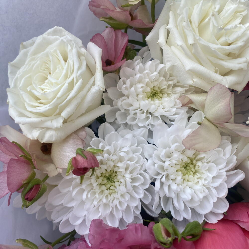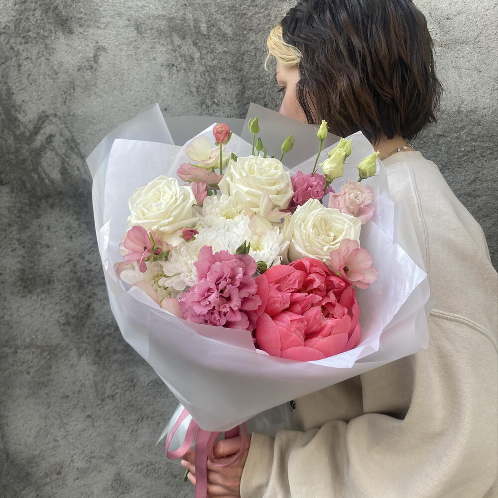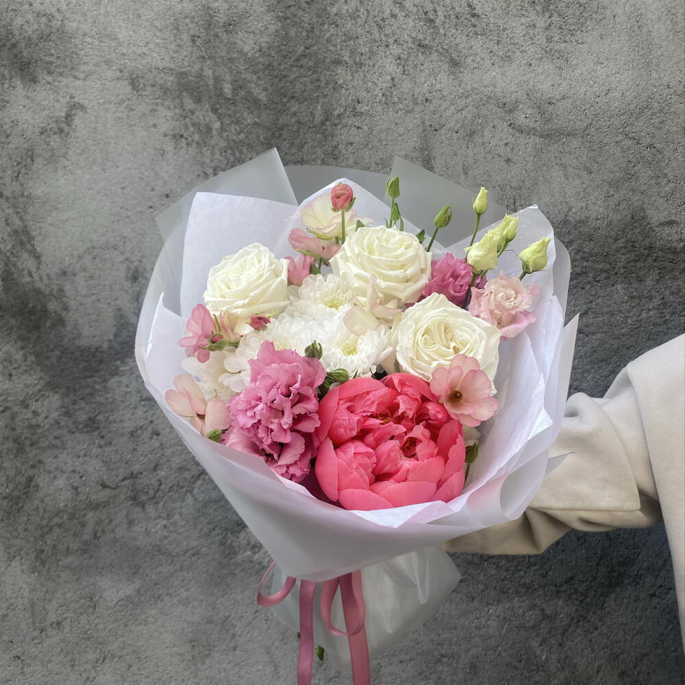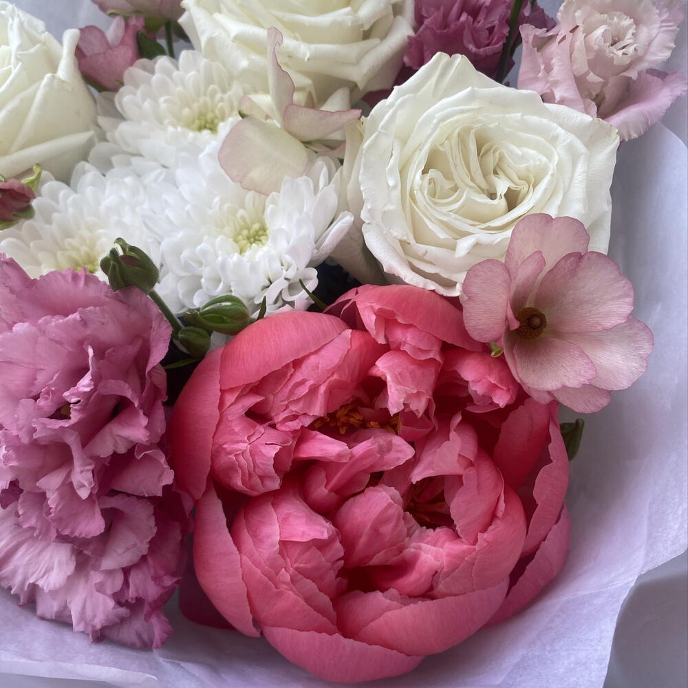 Ribbon - 1 шт. Peony - 1 шт. rose - 3 шт. packaging - 3 шт. ranunculus - 1 шт. hrizantema white - 1 шт. eustoma - 1 шт.