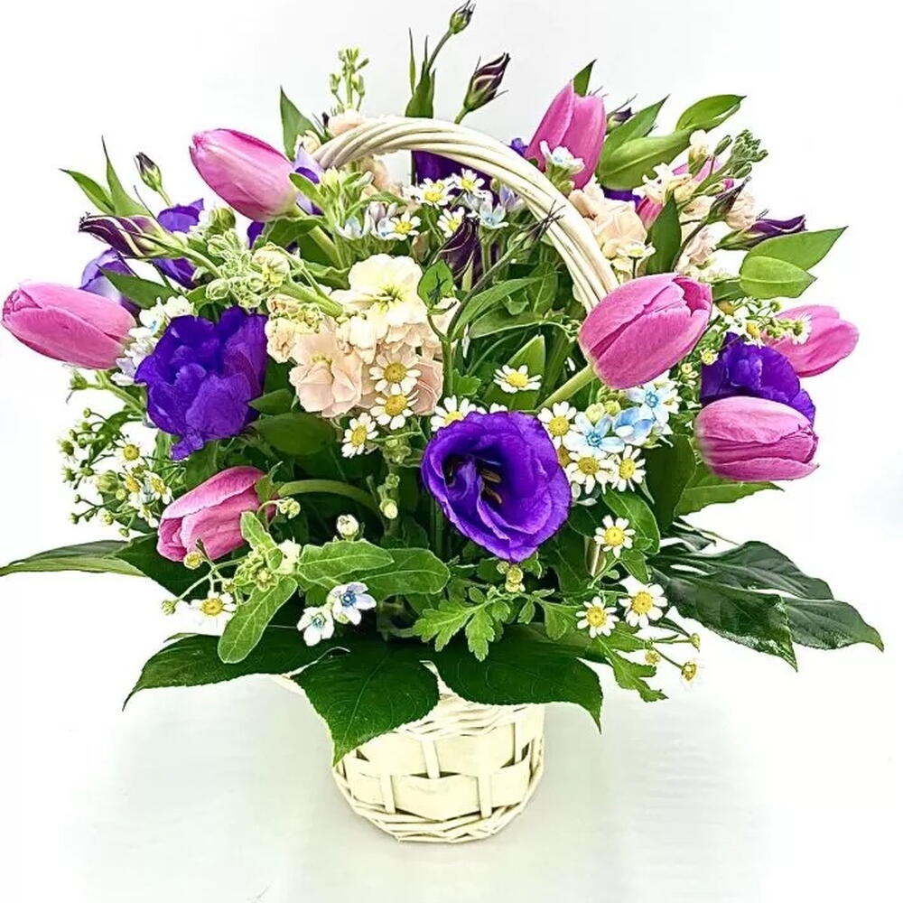 Tulips - 7 шт. Lisianthus - 10 шт. aralia - 4 шт. camomile - 5 шт. twidia - 5 шт.