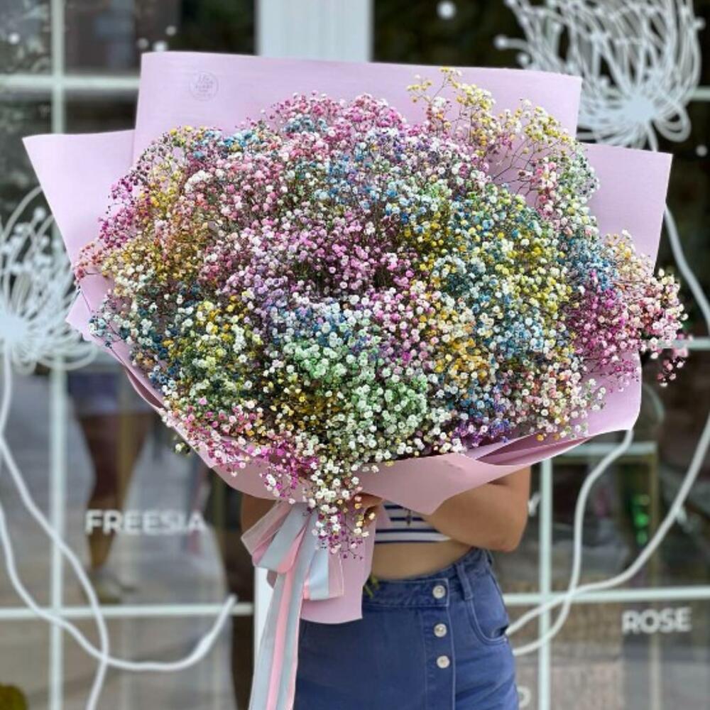 Атласная лента - 3 шт. Корейская упаковка - 4 шт. гипсофила цветная - 27 шт.