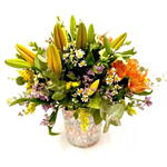 Alstroemeria - 3 шт. Solidago - 4 шт. Lily - 3 шт. ceramic vase - 1 шт. camomile - 5 шт. eukalyptus - 5 шт.