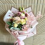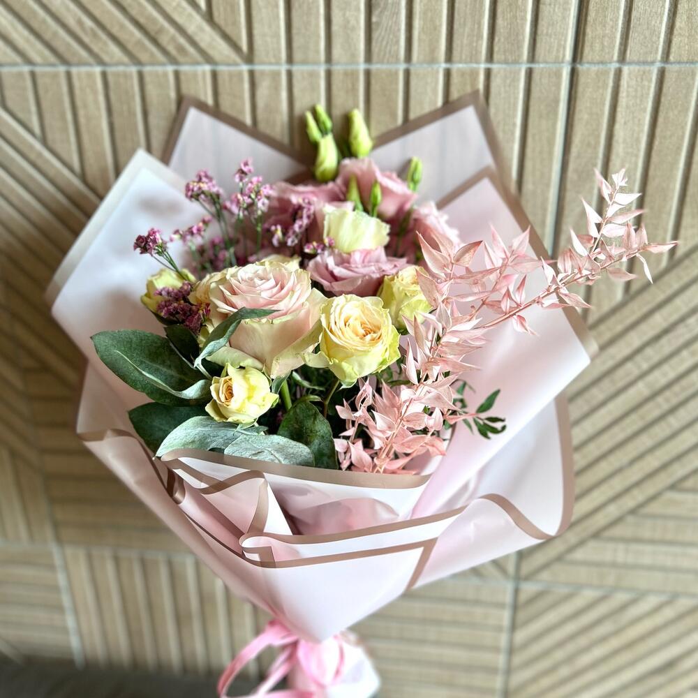 Эустома - 1 шт. Limonium - 1 шт. Greens - 1 шт. rosa ecuador - 1 шт. rosa spray - 1 шт. ruscus stabilized bleached - 1 шт.