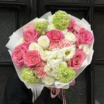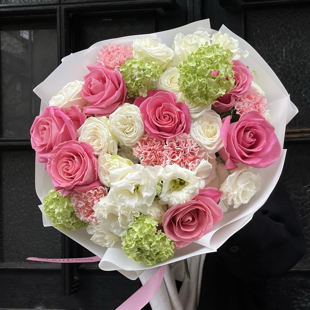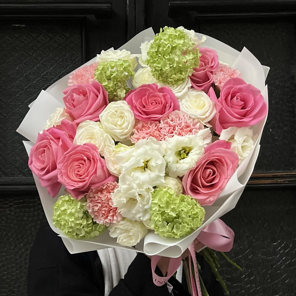 Хризантема - 2 шт. Эустома - 4 шт. Spray rose - 4 шт. Viburnum - 2 шт. dianthus - 5 шт. designer wrapping - 1 шт. ecuadorian roses - 7 шт.