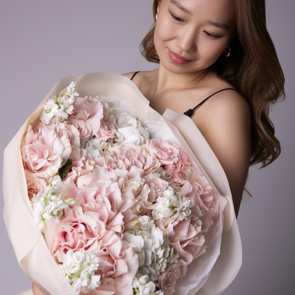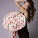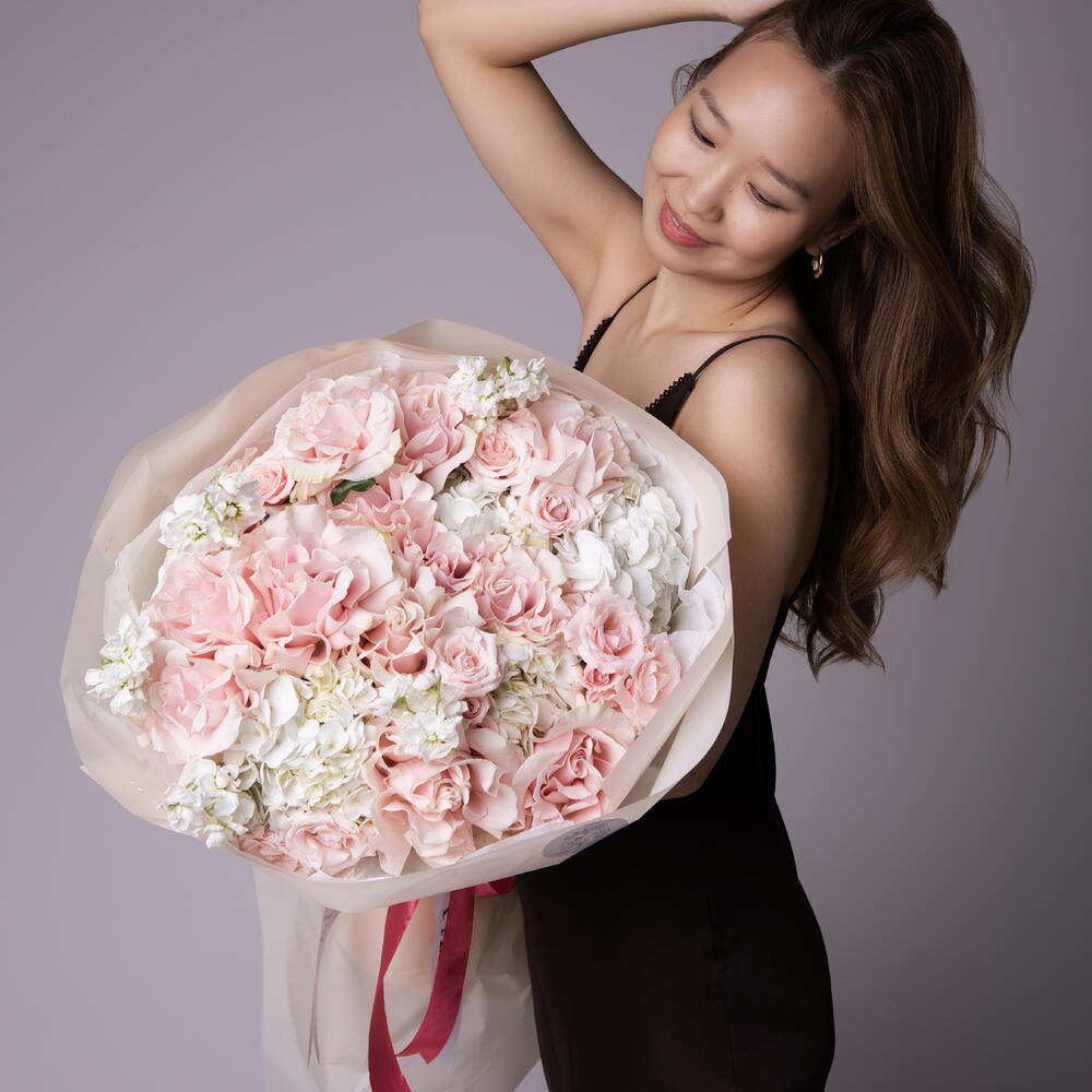 Букет "Нежные чувства" размер L (французские розовые розы, гортензии, розовые кустовые розы, маттиолы)