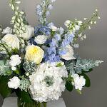 greenery mix - 1 шт. delphinium blue - 7 шт. hydrengea white - 3 шт. roses white - 7 шт. mini carnations white - 5 шт.
