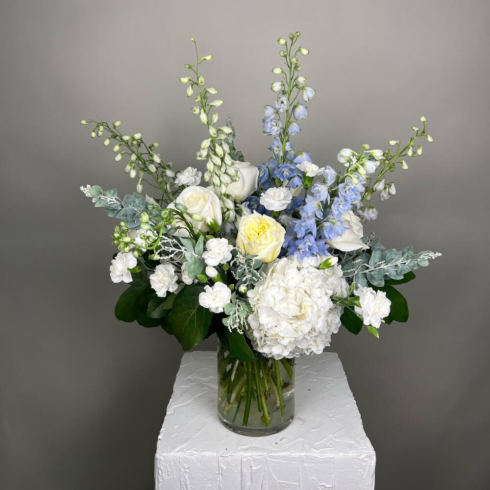 greenery mix - 1 шт. delphinium blue - 7 шт. hydrengea white - 3 шт. roses white - 7 шт. mini carnations white - 5 шт.