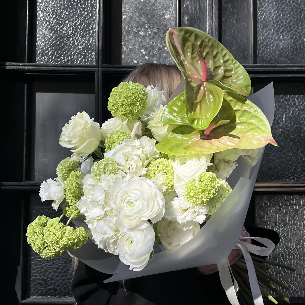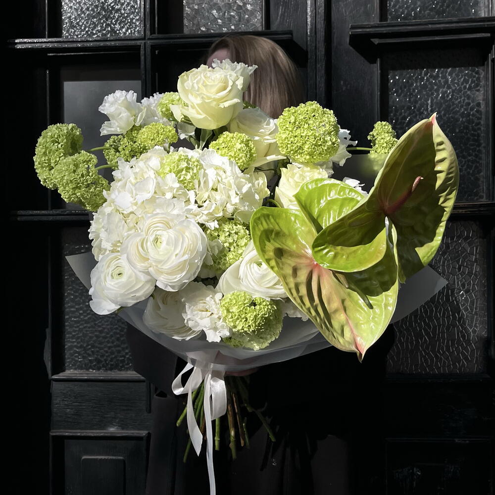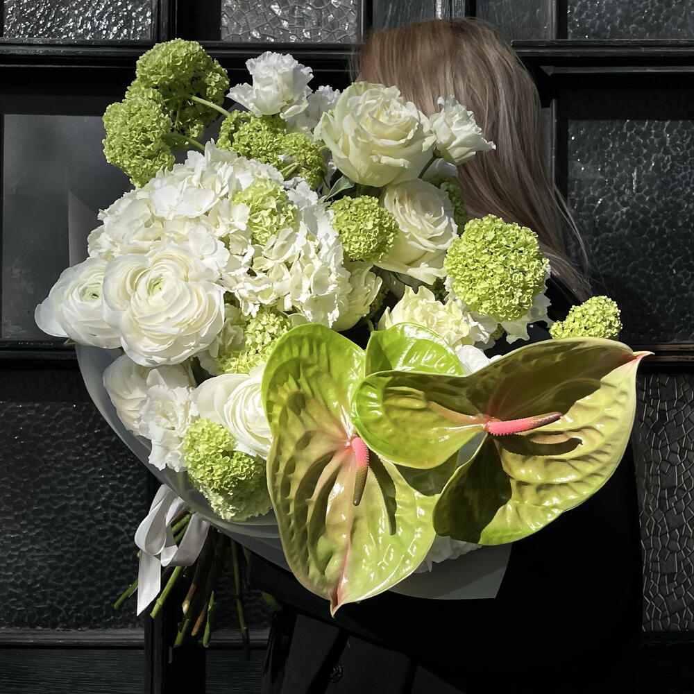 Эустома - 7 шт. Viburnum - 5 шт. hortensia - 2 шт. Anthurium - 2 шт. ranunculus - 5 шт. designer wrapping - 1 шт. ecuadorian roses - 7 шт.