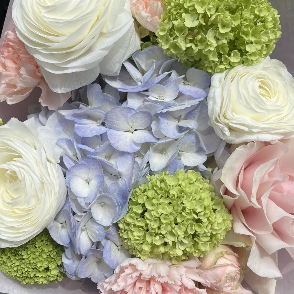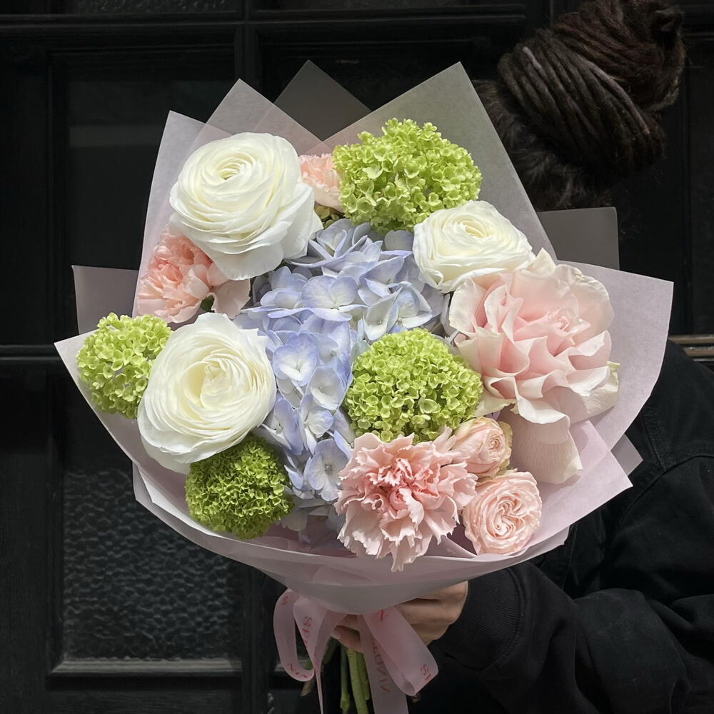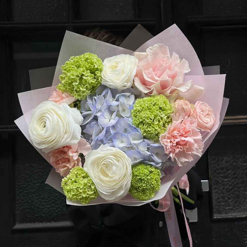 Spray rose - 1 шт. Viburnum - 2 шт. hortensia - 1 шт. dianthus - 3 шт. ranunculus - 3 шт. designer wrapping - 1 шт. ecuadorian roses - 1 шт.