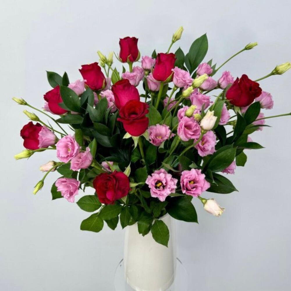 Lisianthus - 10 шт. Ruskus - 10 шт. rose - 6 шт. packaging - 1 шт.