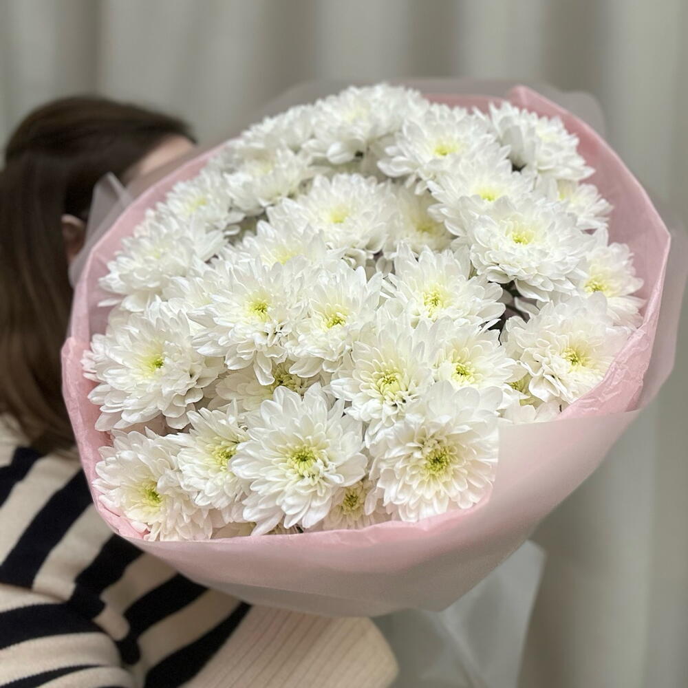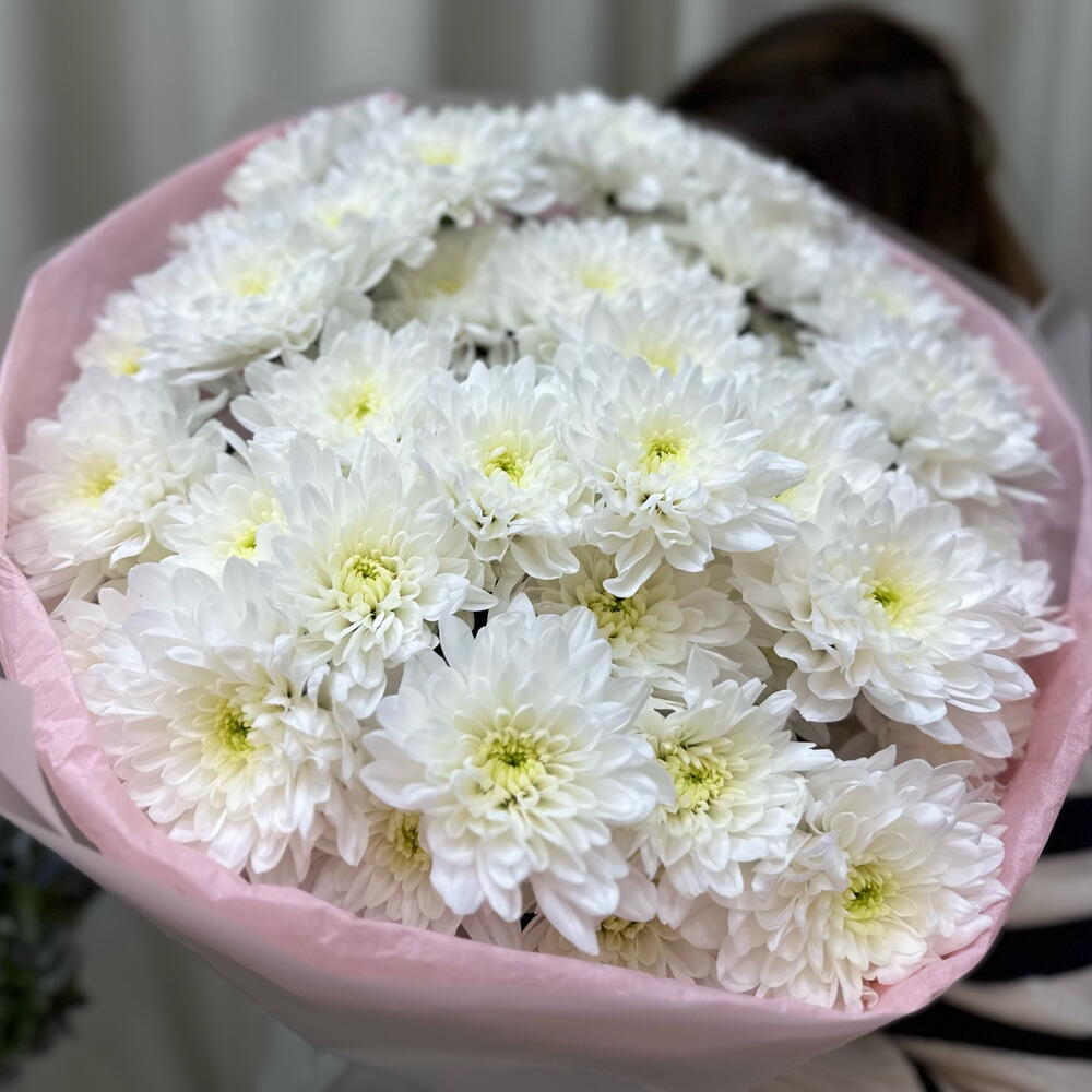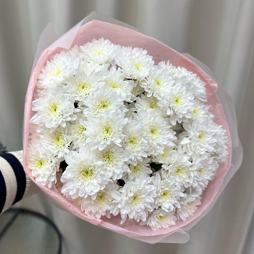 Лента - 2 шт. Хризантема кустовая - 9 шт. Упаковка - 4 шт.