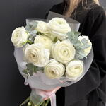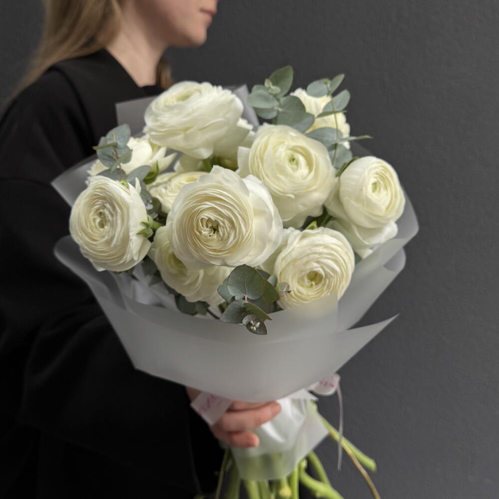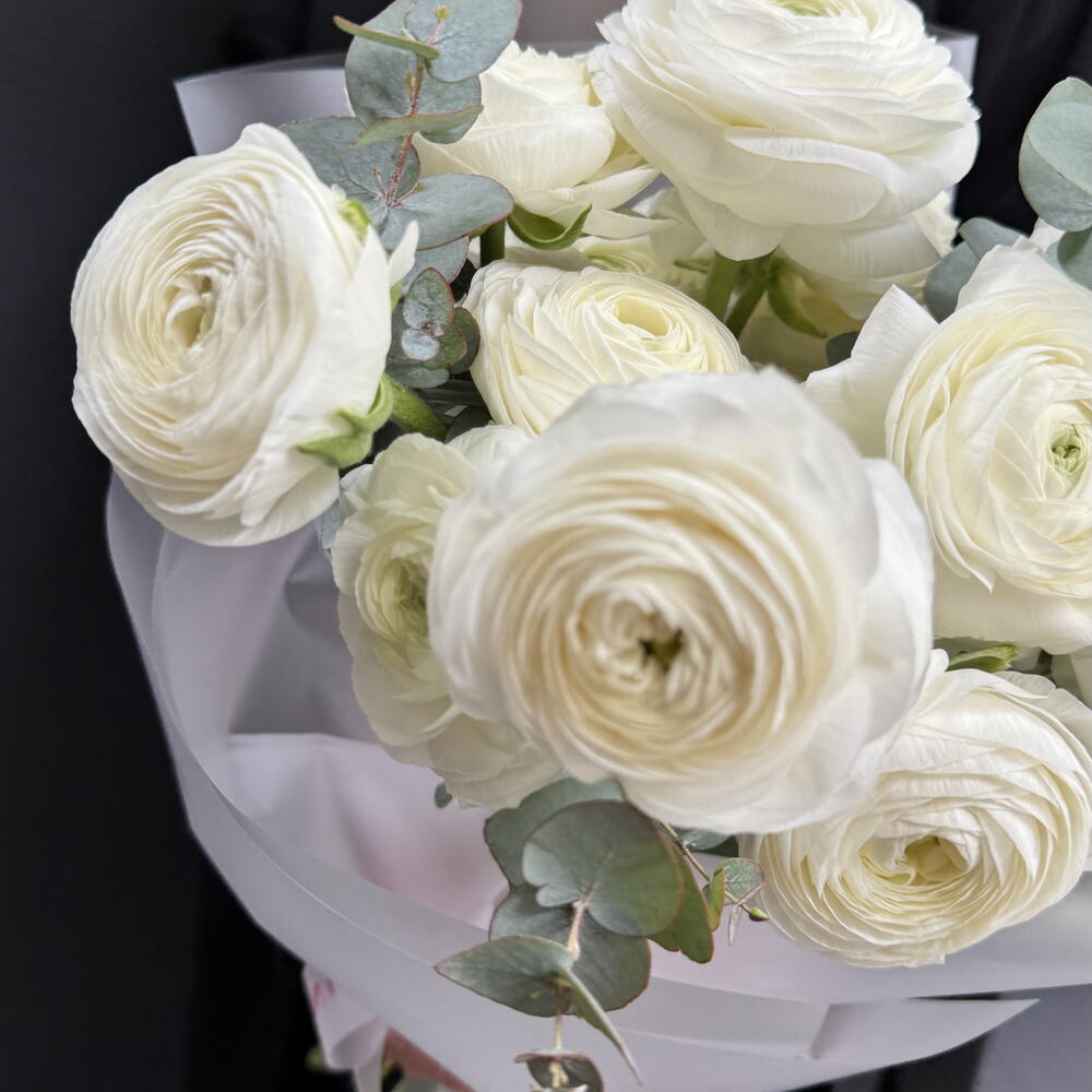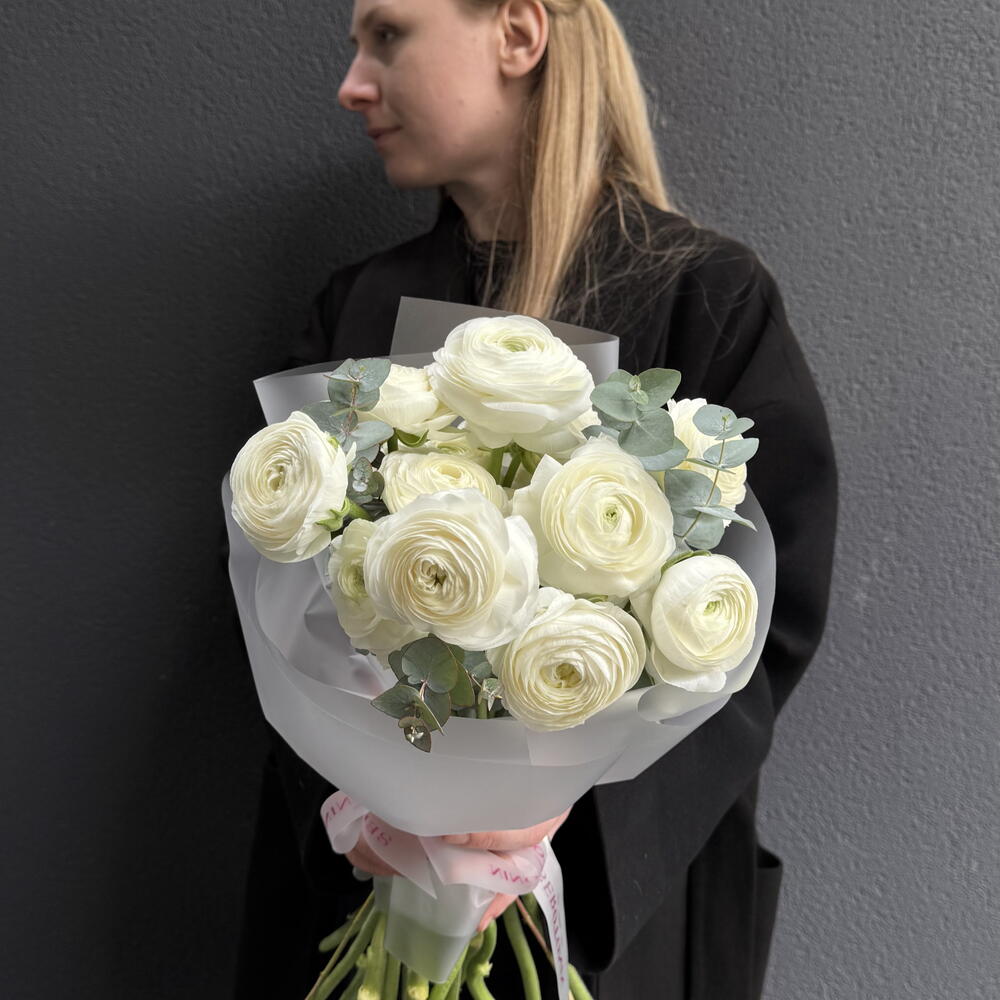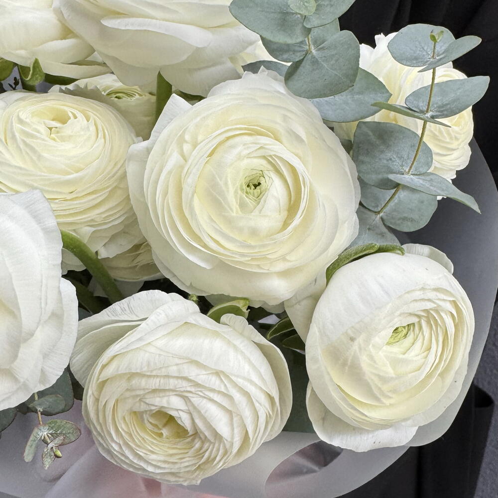 White ranunculus bouquet with eucalyptus A bouquet of fresh white ranunculus with eucalyptus in a modern minimal style. Soft neutral tones make it suitable for any occasion — from a romantic gesture to an elegant gift. Composition: ranunculus, eucalyptus Style: minimal, elegant Color: white / soft cream tones Suitable for: birthday, date, thank you, congratulations Delivery packaging: All bouquets are delivered in an aqua box to keep flowers fresh during delivery, and placed in an individual branded transport box for safe and neat transportation.