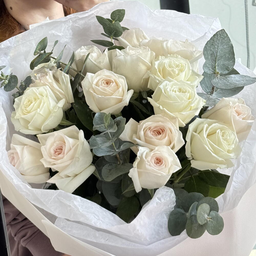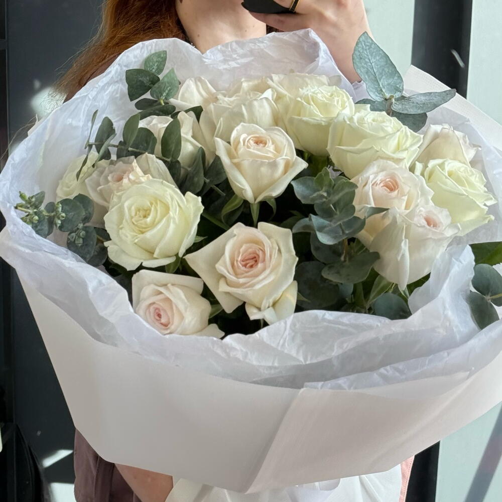 Погрузитесь в возвышенное великолепие этого монобукета. Эта пышная композиция состоит из шести тщательно отобранных зелени, дополненных 17 роскошными белыми розами. Каждый цветок — уникальное свидетельство великолепия природы, олицетворяющее чистоту и любовь. Этот букет — не просто подарок, а поистине захватывающее зрелище, которое пленит зрение и чувства, и идеально подходит для любого случая.