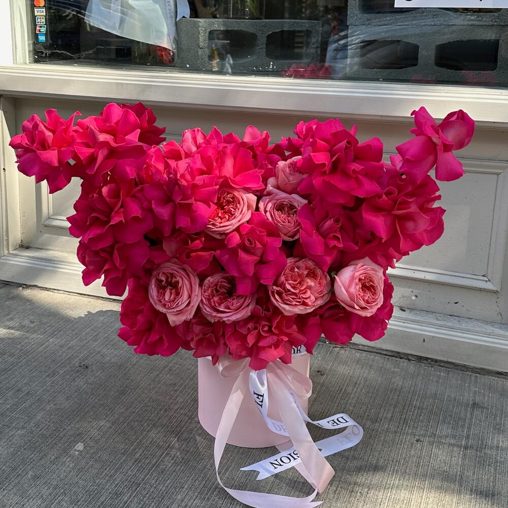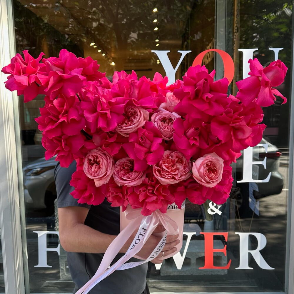 Коробка "Слова любви" (розовые садовые розы сорта "Pink Expression", ярко-розовые французские розы)