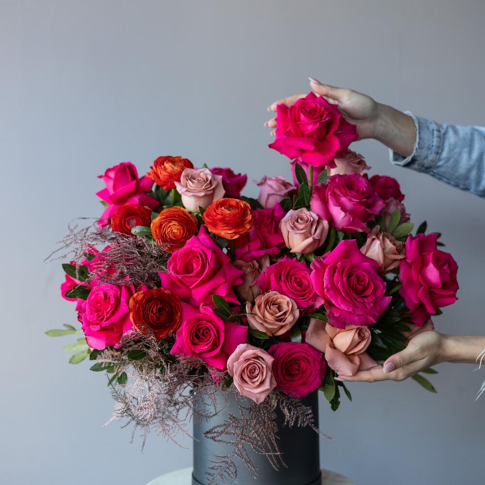 ranunculus - 12 шт. filler - 10 шт. смесь роз - 24 шт.