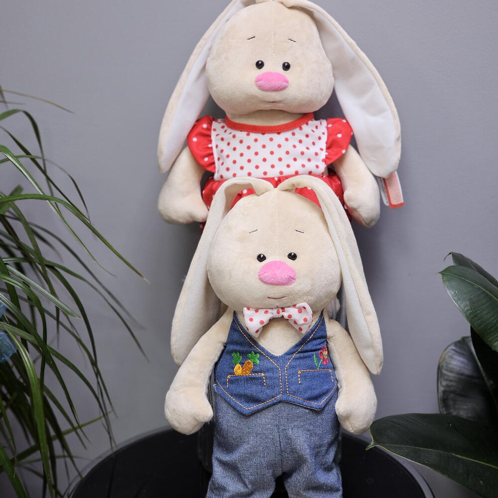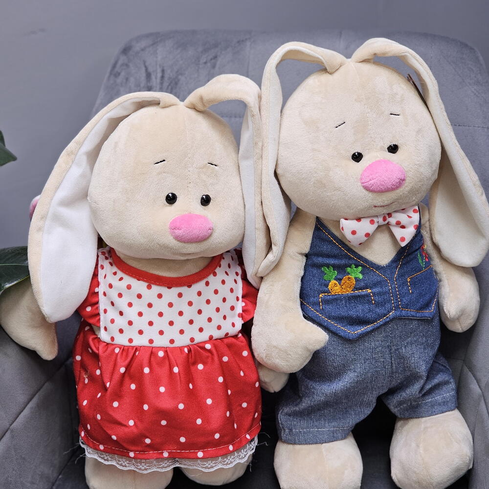 Очаровательные мягкие зайчики — идеальный подарок для любимого человека, ребёнка или просто для уюта в доме. Сладкая парочка — это два милых зайчика, созданные с любовью и вниманием к деталям. Они отлично подойдут для фотосессий, декора комнаты, подарка ко дню рождения, 14 февраля или просто для хорошего настроения. Характеристики: Высота: 43 см Материал: мягкий плюш, гипоаллергенный наполнитель Комплектация: 2 мягких зайчика Безопасны для детей