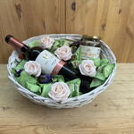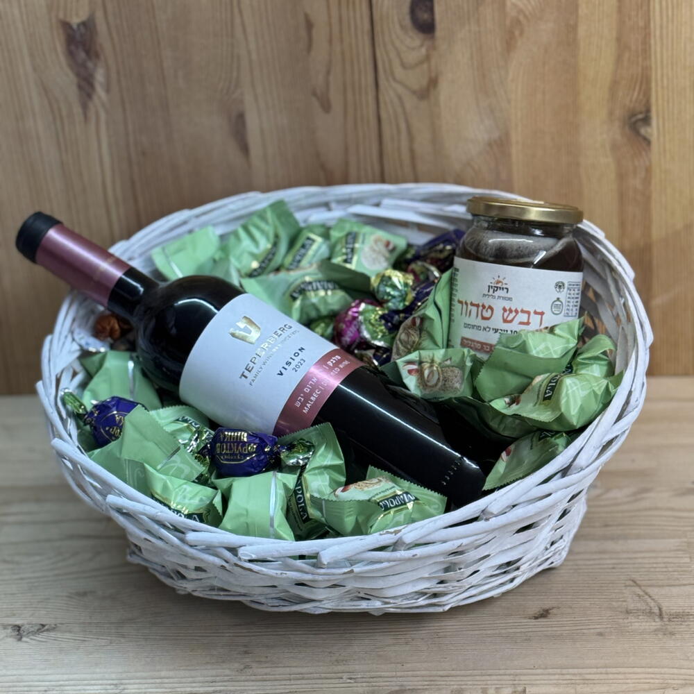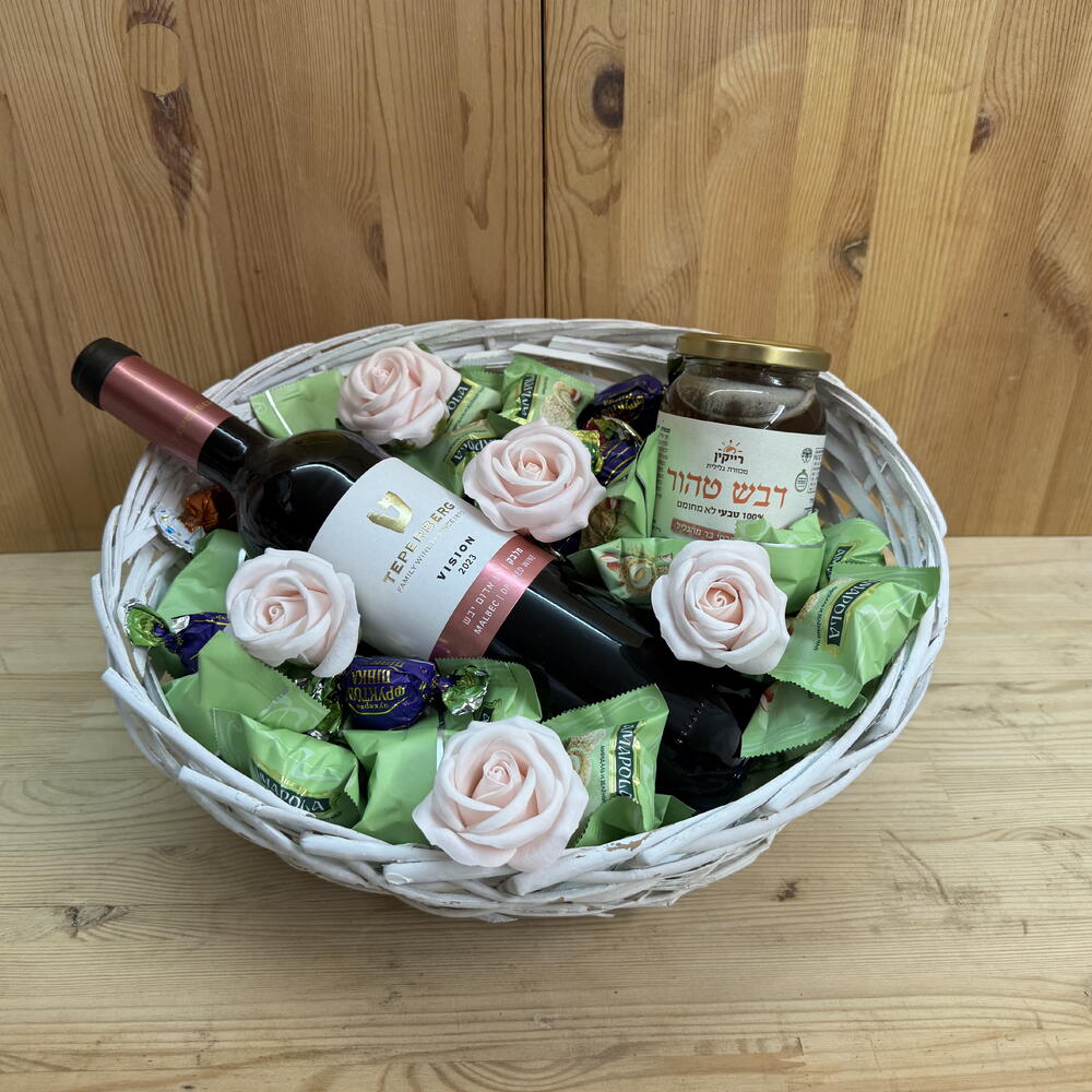 Basket - 1 шт. honey - 1 шт. red wine 750ml - 1 шт. white chocolate confections with coconut and nuts - 35 шт. aromatic decorative flowers - 5 шт.