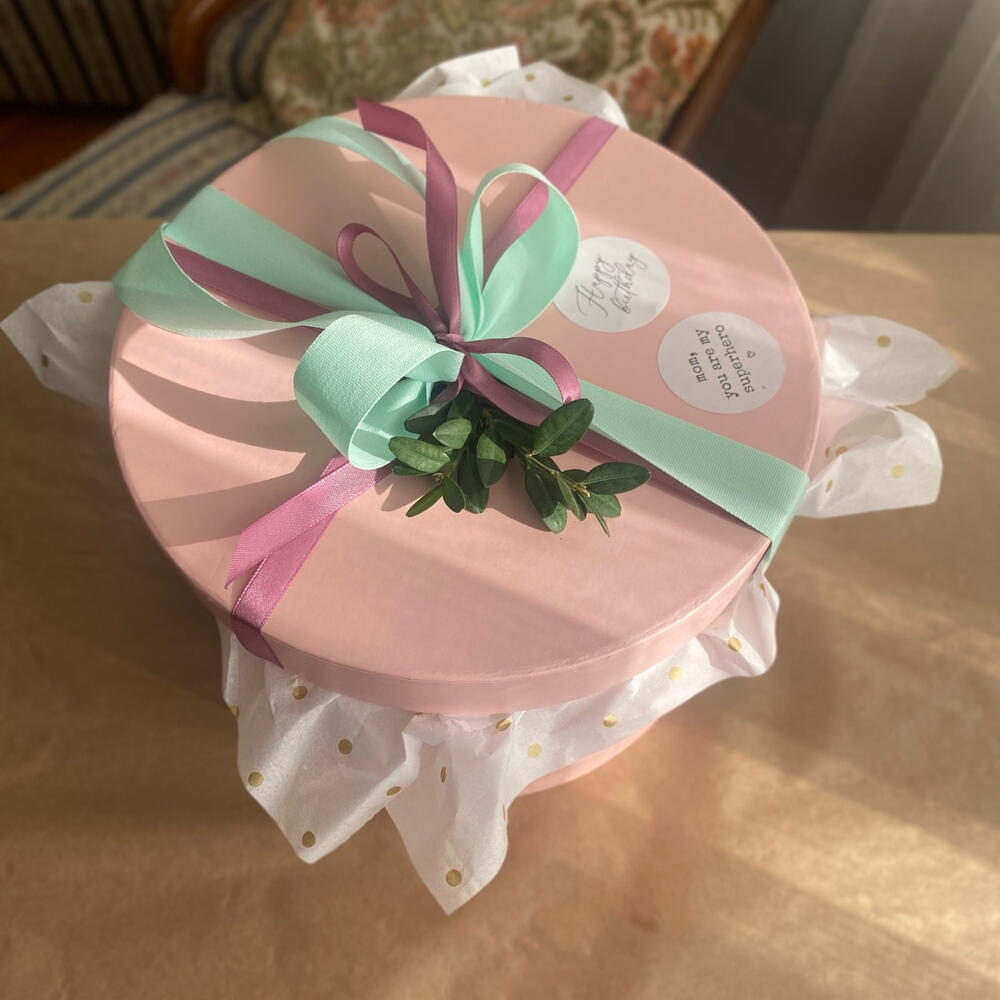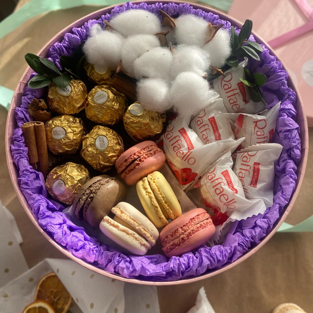 Лента атласная - 1 шт. Открыточка с вашими пожеланиями - 1 шт. Raffaello - 7 шт. Коробка с крышкой - 1 шт. Ferrero rocher - 7 шт. Хлопок натуральный - 3 шт. макарон (пирожное) - 5 шт. мандарины (1 слой) - 400 гр.