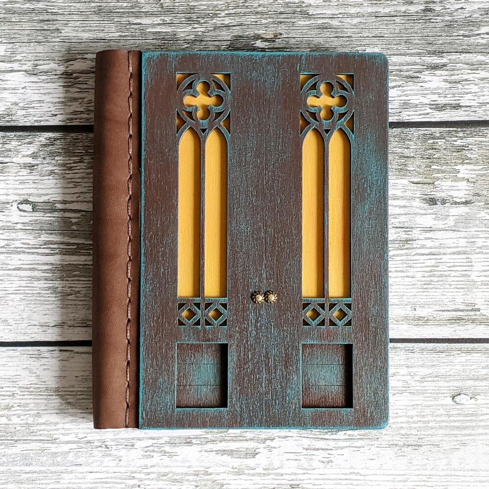 Gothic wooden notebook in the shape of a door