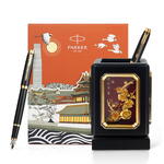 Pen: PARKER Pen Metropolis Gift Box IM Frosted Pure Black Liya Gold Clip Ink Pen Set Remarks: Parker pens can use the same brand of Parker ink core (i.e. ink cartridge) Pencil case: Jinyue Treasures - Sijunzi Meilan Bamboo Chrysanthemum Rotating Pencil Box Gift Box Package volume: about: 17×17×19CM Gross weight: about 1KG Item number: LHB-003 Sijunzi