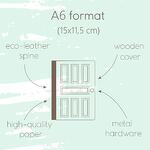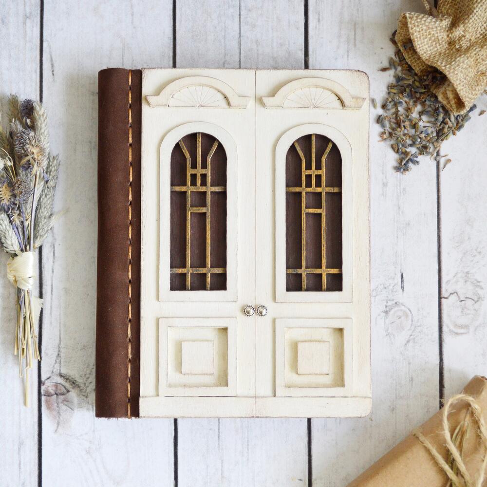 A unique handmade notebook with a door-shaped cover is a great gift for an artist, someone who sketches, takes notes, keeps a diary or day planner, or any lover of unusual gifts. THE COVER OF THE JOURNAL We make covers from high-quality plywood, paint them by hand with acryl paints and then cover them with water-base varnish. That is why the texture of every journal cover is unique. The hardcover works as a hard surface to let you draw or make notes anywhere you get inspired. The plywood cover protects paper as well. ECO-LEATHER BINDING For binding we use high-quality eco-leather. It is wear proof and pleasant to touch. PAPER We use fine designer eco paper Flora Anice that is 30% recycled and contains plant inclusions, so each page looks unique and textured. Еhe color of the paper is soft cream. It is suitable for pencils, pens and liner. The pages are padded, so it is easy to unfold the journal flat and write and draw in it. The journal has 64 sheets (128 pages). HARDWARE We use metal hardware to make our journals look prettier and smarter. If you have questions left or you want to customize your purchase, feel free to contact me and I will try to make your dream journal :)