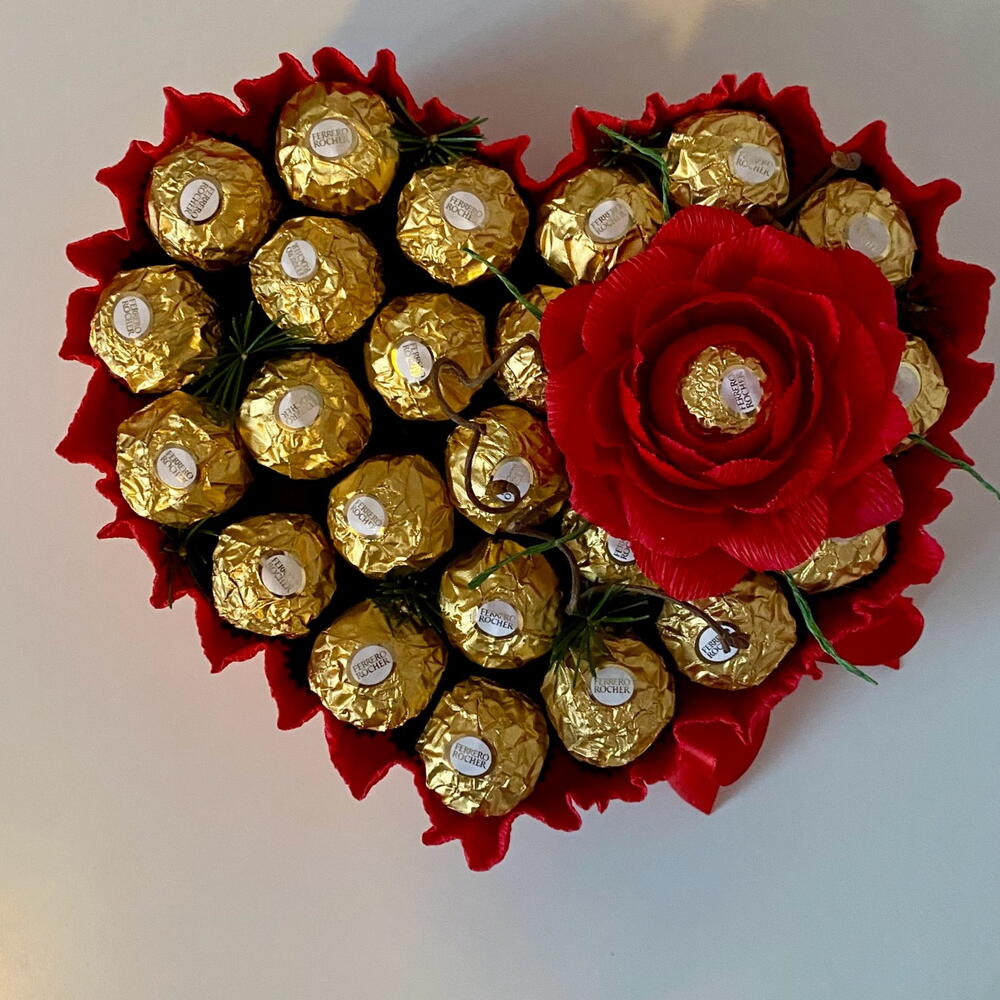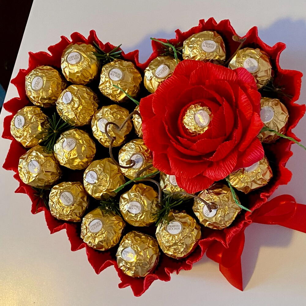 Ferrero rocher - 24 pcs korilius - 1 pcs foam base - 1 pcs roses made of corrugated paper - 1 pcs