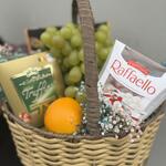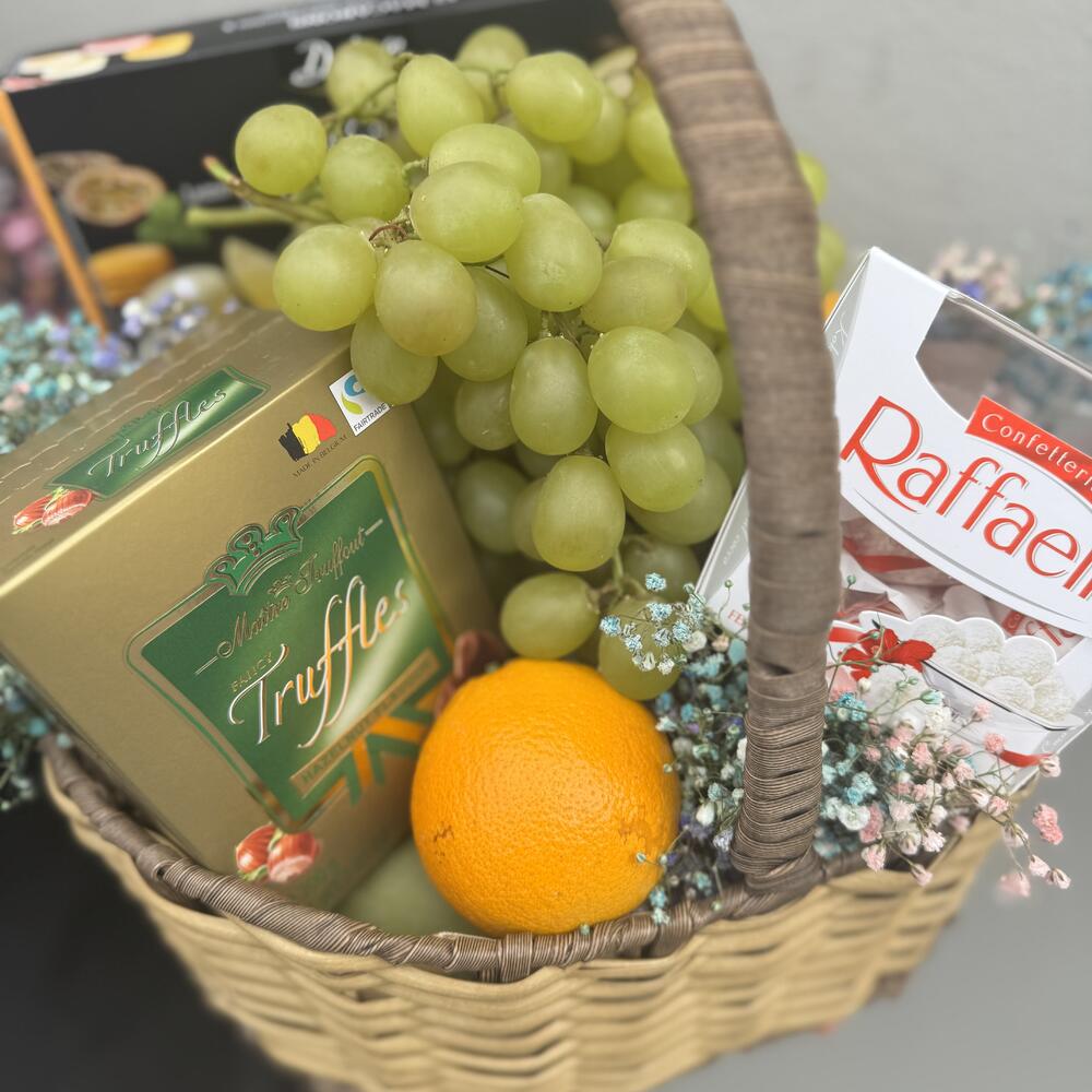 Macarons - 1 pcs Basket - 1 pcs grape - 500 g rafaello candies - 1 pcs truffle sweets - 1 pcs apelsiin - 3 pcs