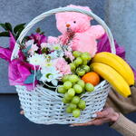 Eucalyptus - 3 pcs Ruscus - 1 pcs Chrysanthemum - 1 pcs Alstroemeria - 1 pcs Basket - 1 pcs Pistacia - 2 pcs rose bush - 1 pcs dianthus - 2 pcs mandarin - 5 pcs grapes - 2 pcs mango - 1 pcs bananas - 2 pcs taddy bear - 1 pcs