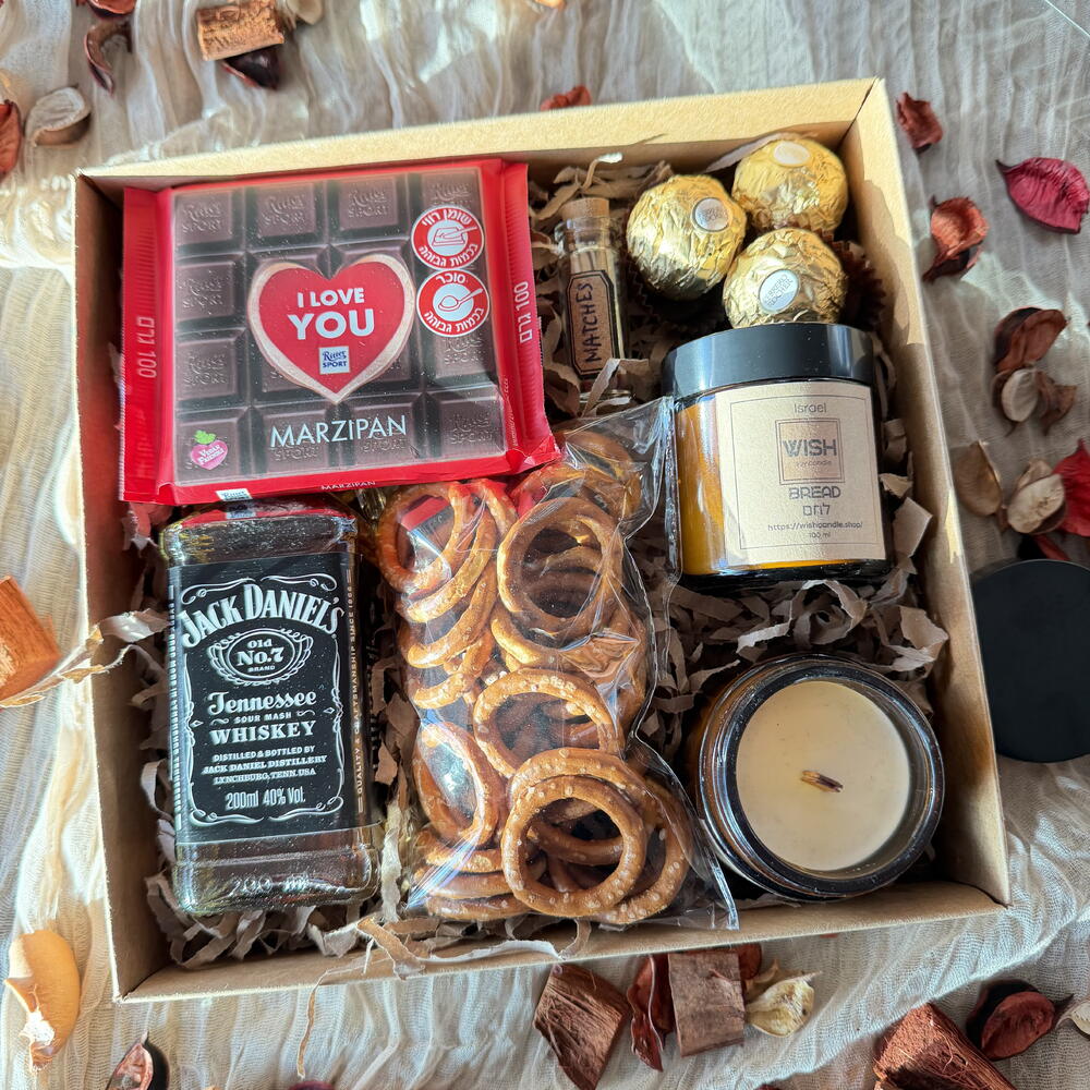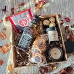 Box - 1 pcs Ferrero rocher - 3 pcs Jack daniels - 200 ml Ritter sport - 1 pcs matches - 1 pcs pretzels - 50 g candle in a jar - 2 pcs