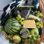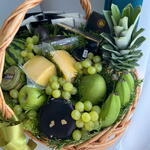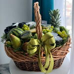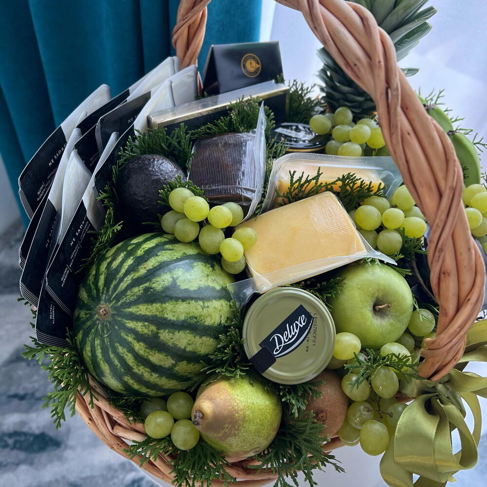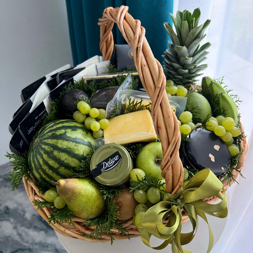 Basket wicker - 1 pcs pineapple - 1 pcs pear - 5 pcs mango - 3 pcs watermelon mini - 1 pcs passion fruit - 5 pcs bananas - 5 pcs avocado - 3 pcs tea - 1 pcs grapes bunch - 3 pcs pistachio paste - 1 pcs premium cheese - 3 pcs lindt candies - 1 pcs red plum - 5 pcs homemade honey 500 g - 1 pcs premium meat cuts - 9 pcs caviar - 1 pcs