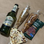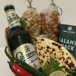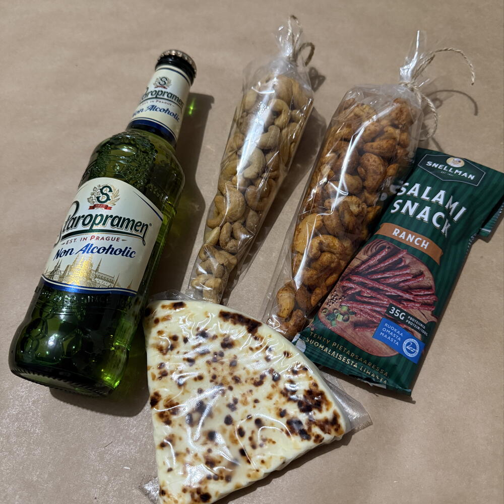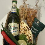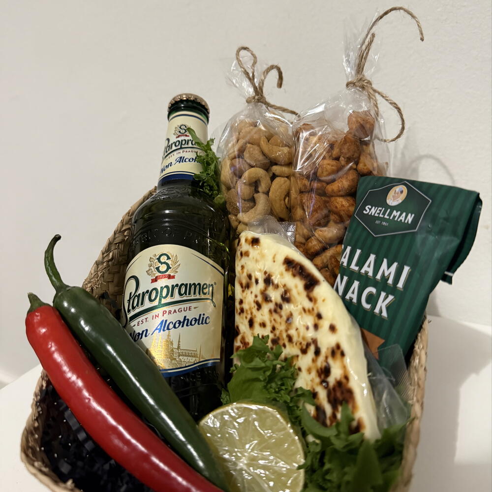 Basket - 1 pcs cashews - 150 g salami mini - 60 g staropramen beer - 330 ml cashews with parrica - 150 g