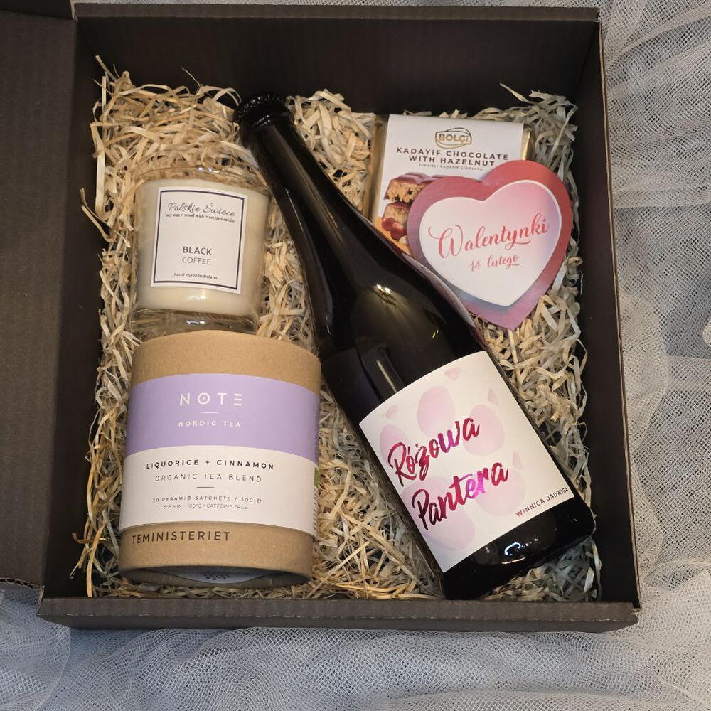 milk chocolate with nut filling 100g - 1 pcs natural dry sparkling rosé wine - 1 pcs tea organic tea blend liquorice+cinnamon - 1 pcs scented soy candle: black coffee - 1 pcs