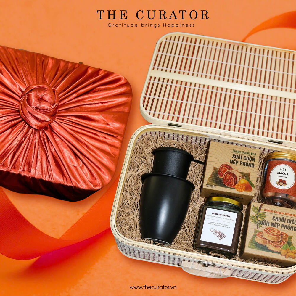 Vietnam is home to an abundance of exquisite flavors, and The Curator has carefully handpicked the finest among them to create the Vietnam Flavor Treasure Gift Set - A true celebration of taste and tradition. At the heart of this premium set is a sleek black-glazed ceramic mug paired with a matching aluminum coffee filter, exuding elegance and authenticity. Of course, no Vietnamese gift set would be complete without a selection of regional specialties - rich aromatic coffee, buttery macadamia nuts, crunchy banana-cashew bites, and chewy mango rolls—all offering a delightful journey through Vietnam’s diverse culinary landscape. Beautifully encased in a handcrafted black bamboo box, this gift is more than just a thoughtful present for partners or loved ones - it’s a tribute to Vietnamese craftsmanship and culture. All items are contained in a skillfully woven rattan box, tied with a luxurious Japanese Furoshiki-style silk scarf (The silk scarf can be reused with clothing, and handbags)