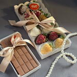 Комбо из самых вкусных десертов: дубайской плитки шоколада и клубники в шоколаде. Дубайская плитка выполнена в фирменном исполнении, с добавлением в начинку фисташковой пасты и белого шоколада. Клубника идет с двумя видами шоколада: 6 в молочном, 6 в белом. Она украшена вкусными хрустяшками и сублимированной ягодой, что усиливает вкус данного десерта. К тому же такой набор выгоднее. Мы будем рады видеть его исполнить индивидуально для Вас🫶