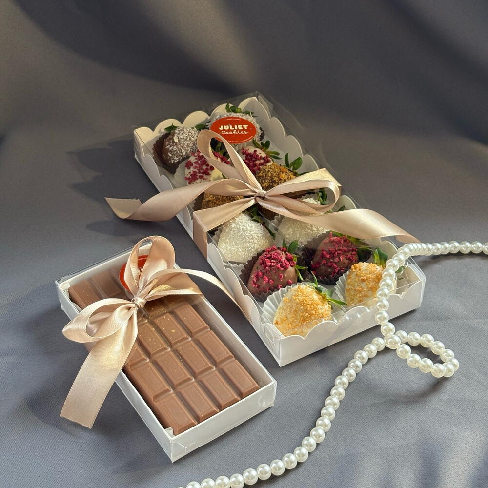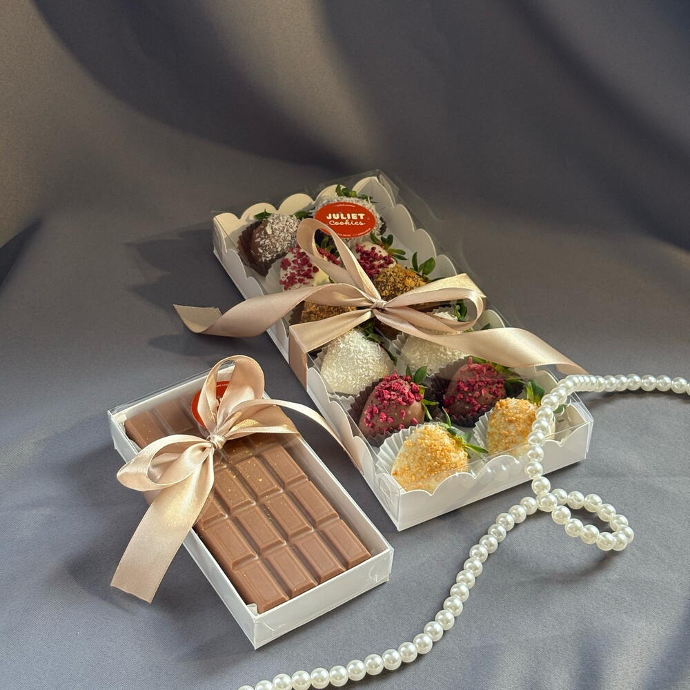 Комбо из самых вкусных десертов: дубайской плитки шоколада и клубники в шоколаде. Дубайская плитка выполнена в фирменном исполнении, с добавлением в начинку фисташковой пасты и белого шоколада. Клубника идет с двумя видами шоколада: 6 в молочном, 6 в белом. Она украшена вкусными хрустяшками и сублимированной ягодой, что усиливает вкус данного десерта. К тому же такой набор выгоднее. Мы будем рады видеть его исполнить индивидуально для Вас🫶