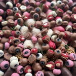 mandarins, bananas, strawberries, raspberries, blackberries, blueberries, white chocolate, dark chocolate, milk chocolate, nuts almonds.