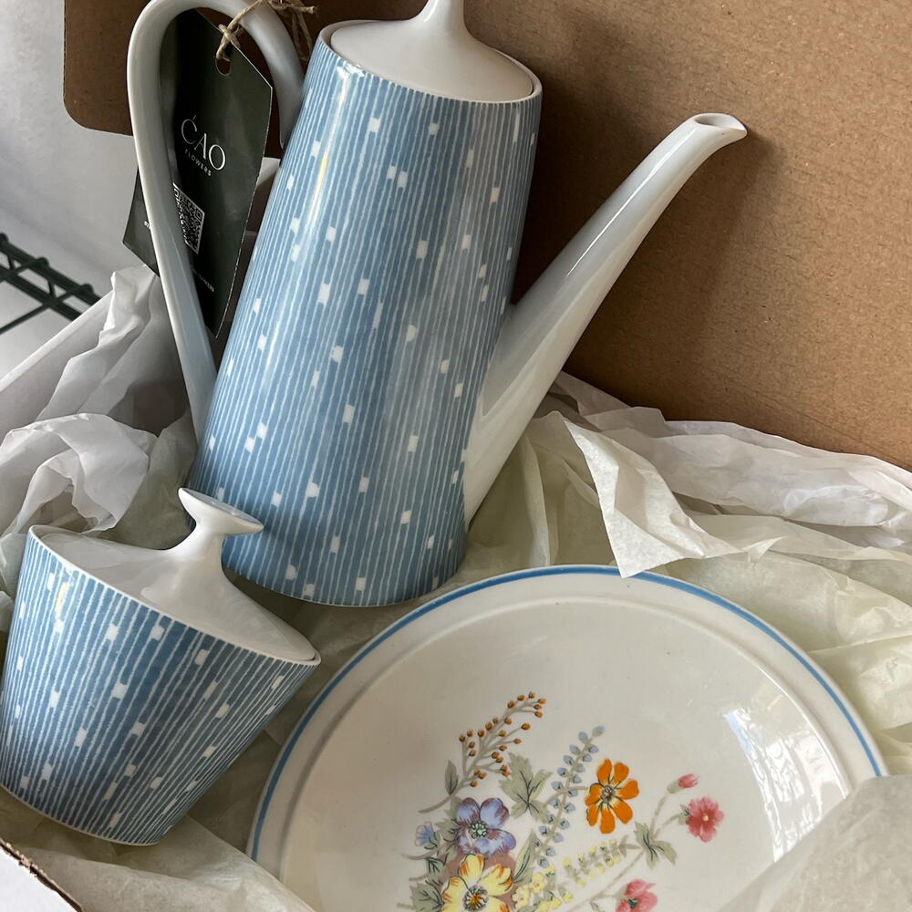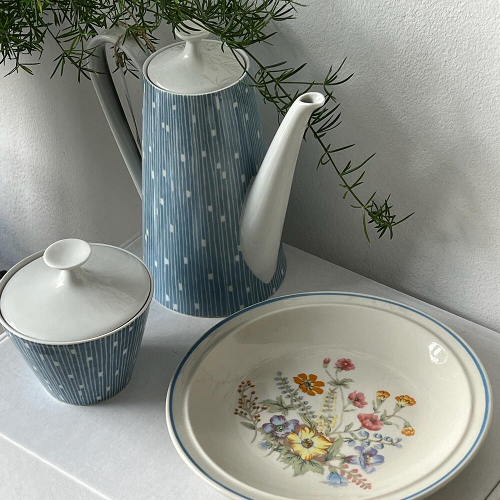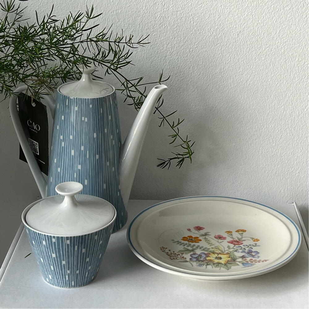 Soft spring set in light blue tones: a vintage coffee pot, sugar bowl, and plate, as if discovered at a quiet morning flea market. Light, airy, and gently nostalgic — perfect for cozy breakfasts and beautiful moments