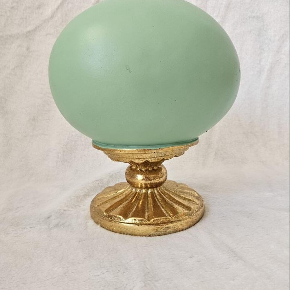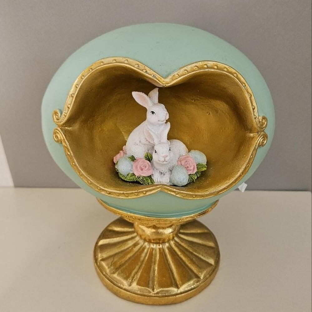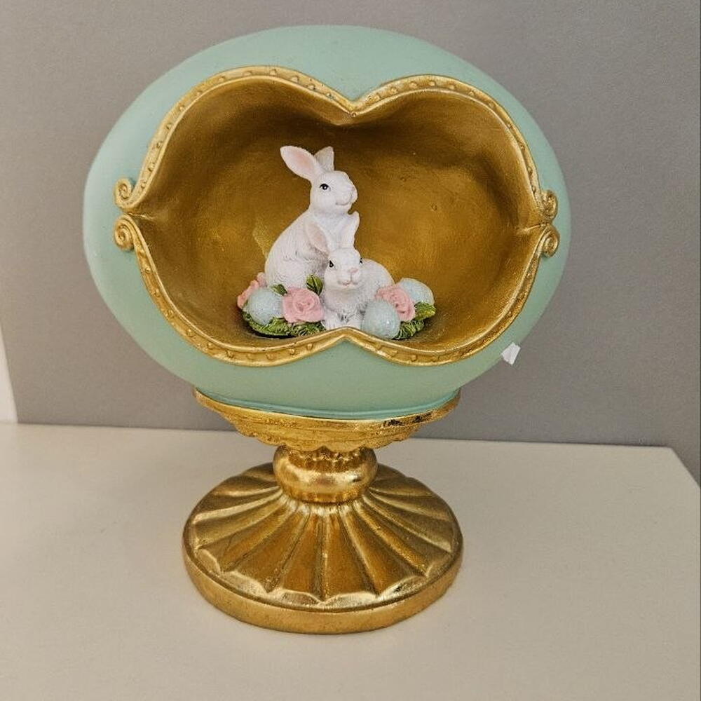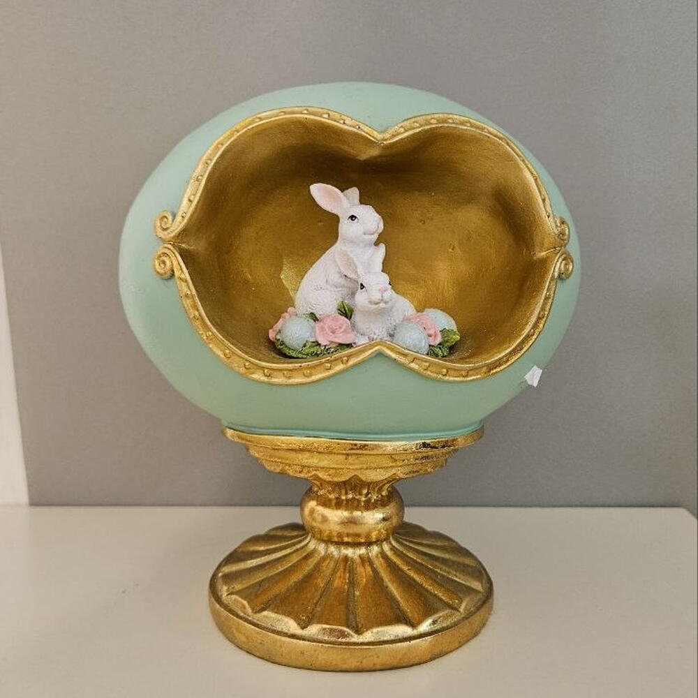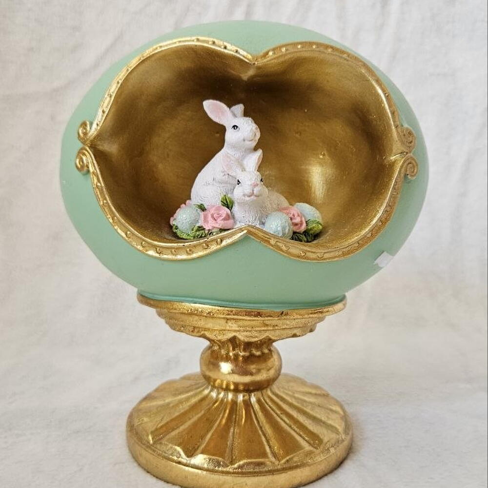 Mat nane yeşili ve altının mükemmel kombinasyonu, hem klasik hem de modern iç mekanlara uyum sağlar. Bu zarif Paskalya figürü, dekoratif bir nane yeşili yumurtanın içinde saklı sevimli beyaz tavşanları tasvir eder. Dekorasyon, retro/göz alıcı bir stile sahiptir – yumurtanın içi ve zarif, oluklu tabanı antik altın renginde tamamlanmıştır ve tümüne benzersiz bir karakter kazandırır. İçinde, hassas bir şekilde işlenmiş bir sahne bulacaksınız: narin pembe çiçekler ve pastel yumurtalarla çevrili bir çift tavşan. Ürün, dayanıklılık ve olağanüstü detaylara dikkat edilmesini sağlayan yüksek kaliteli polirezin (polimer reçine)den yapılmıştır. Figür yaklaşık 19 cm yüksekliğinde ve 16,5 cm genişliğindedir, bu da onu bir bayram sofrası için ideal bir orta parça veya şık bir hediye yapar.