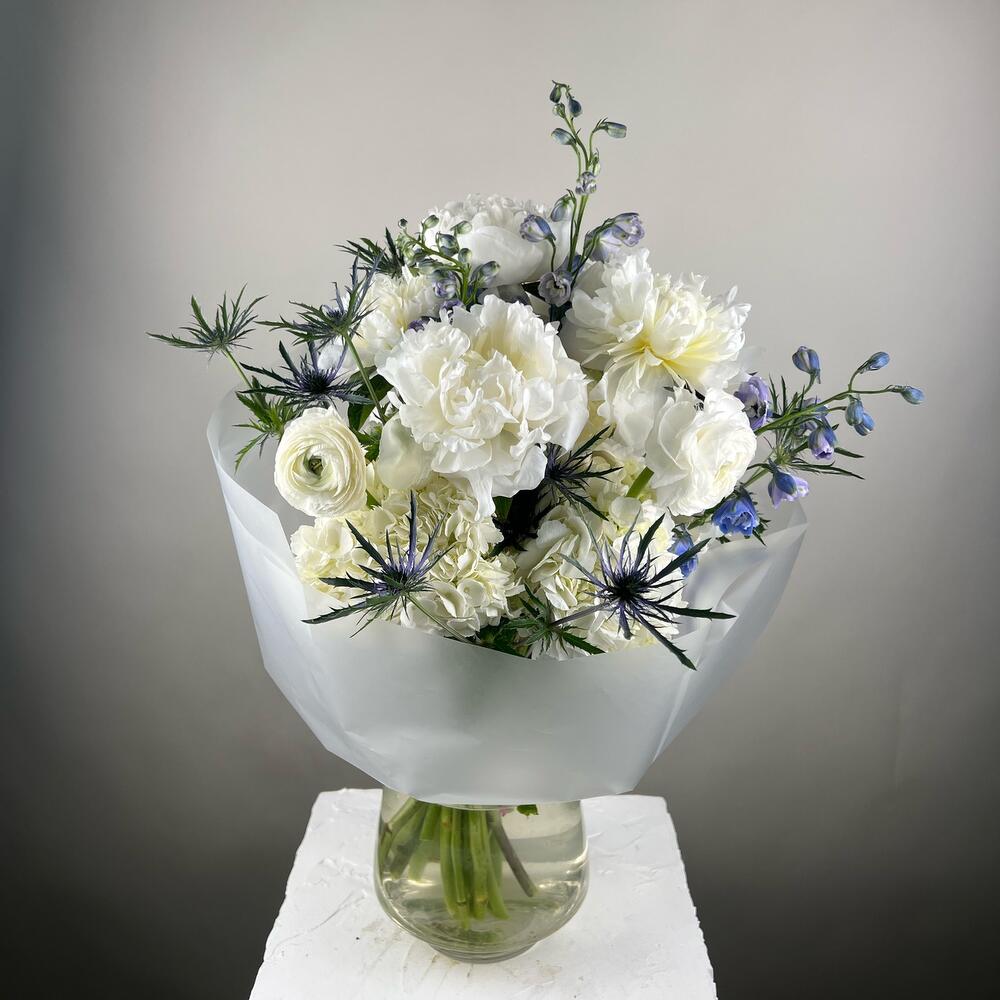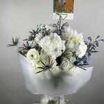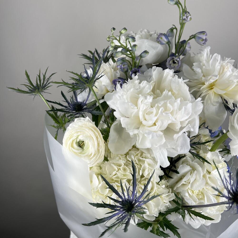 ranunculus - 5 adet hydrangea white - 4 adet peonies white - 5 adet eringium mavi - 3 adet mavi delphinium - 5 adet