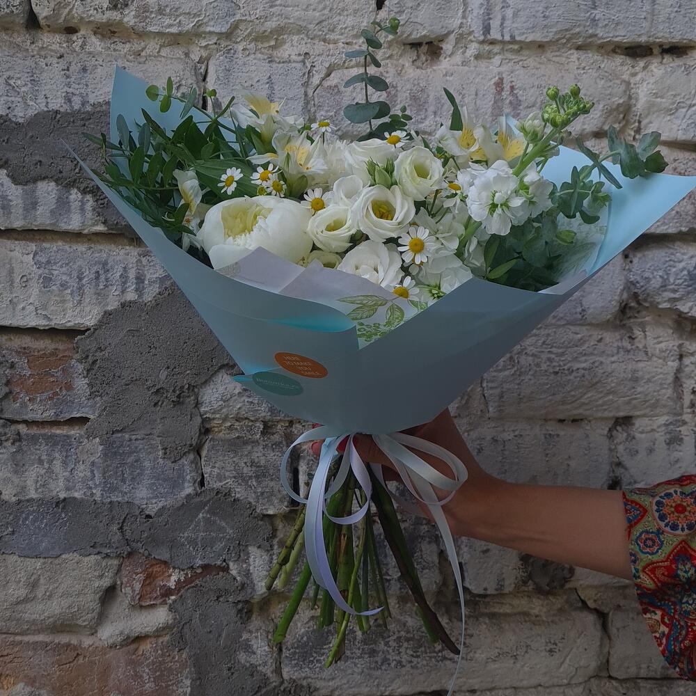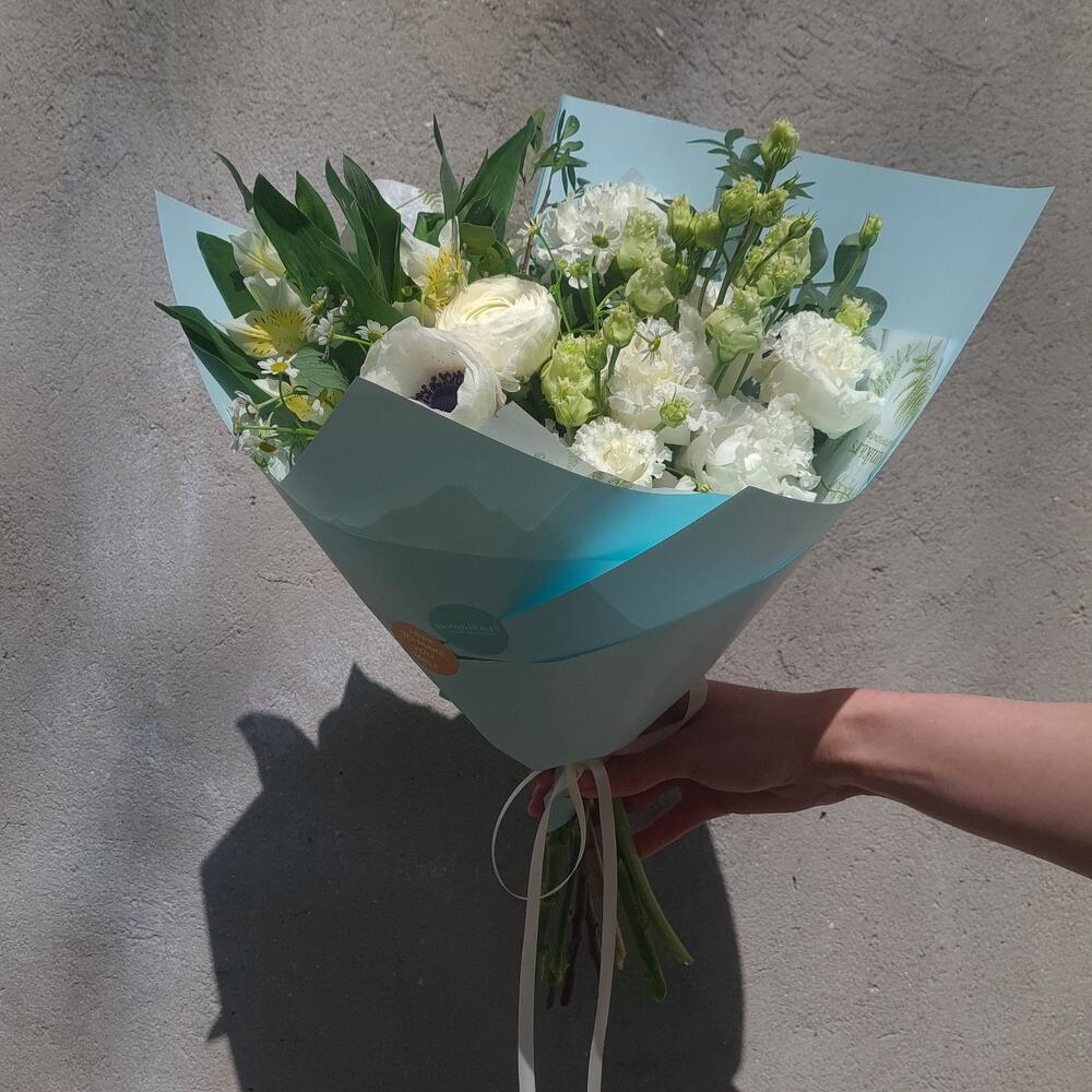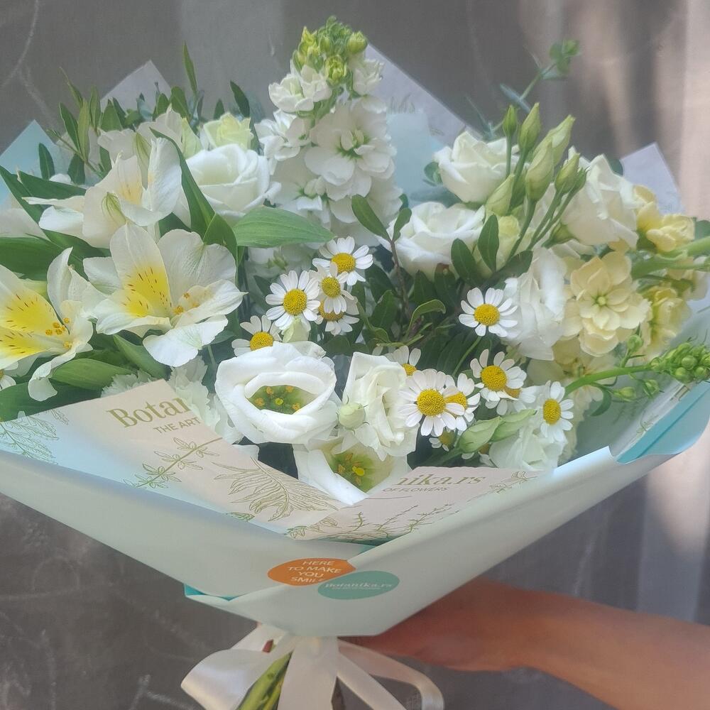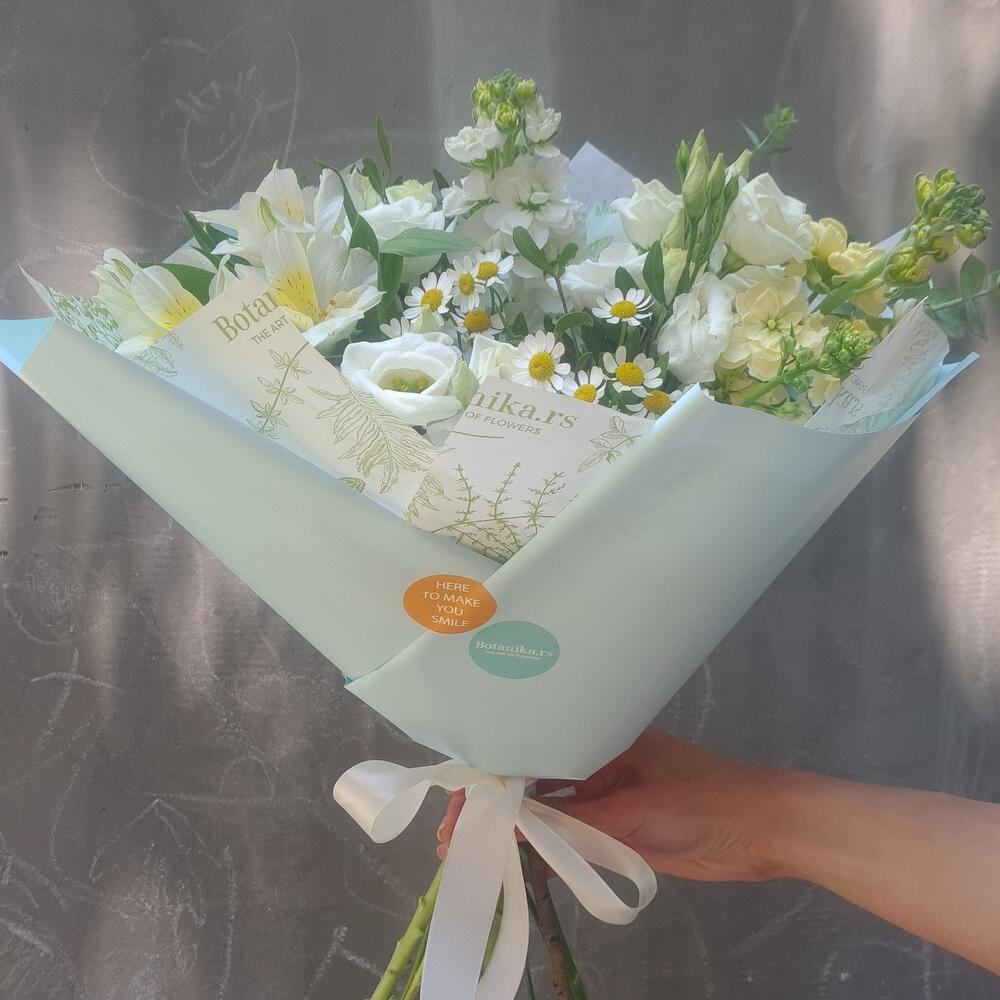 Fresh seasonal bouquet inspired by the feeling of flowers after rain. Natural textures and light colors create a calm and refreshing mood. • Fresh flowers, daily selection • Same-day delivery in Belgrade • Photo confirmation before delivery • Carefully packed by our florist