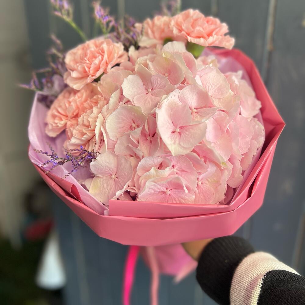 Limonium - 1 adet pembe ortanca - 1 adet pembe karanfil - 5 adet