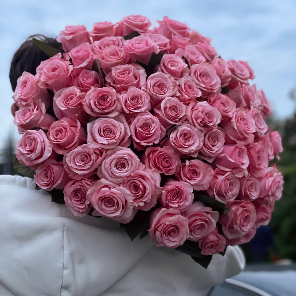Yoğun, doygun pembe tonunda 65 gülden oluşan bir buket; belirginliği ve tazeliğiyle dikkat çeker. Ambalajın olmaması çiçeklerin doğal formunu vurgular, şık bir kurdele ise bütünlüğe zarif, asil bir karakter kazandırır. Bu, basit ama son derece etkileyici bir kompozisyon — enerji, renk ve duyguyla dolu. Mevsime bağlı olarak güllerin çeşidi ve tonu hafifçe değişiklik gösterebilir. Belirli bir tür bulunmaması durumunda, buketin yoğun karakterini koruyarak benzer pembe tonlarda yüksek kaliteli güller seçilir.