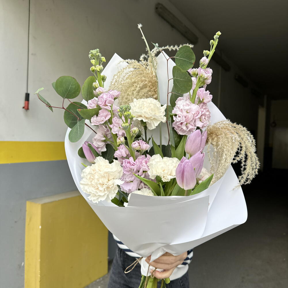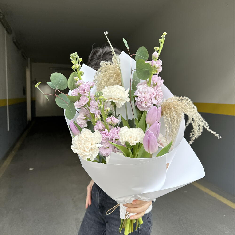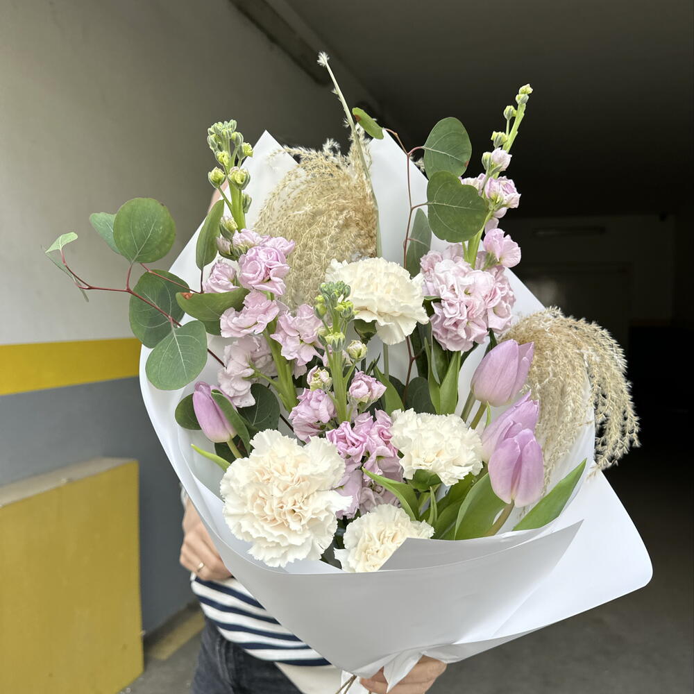 Eucalyptus - 2 adet Tulip - 4 adet carnation - 4 adet matthiola - 3 adet miscanthus - 2 adet