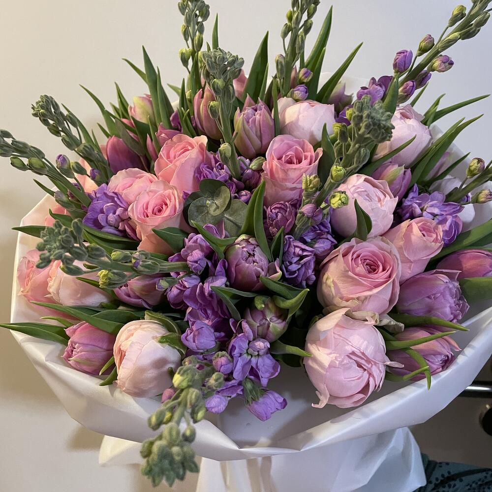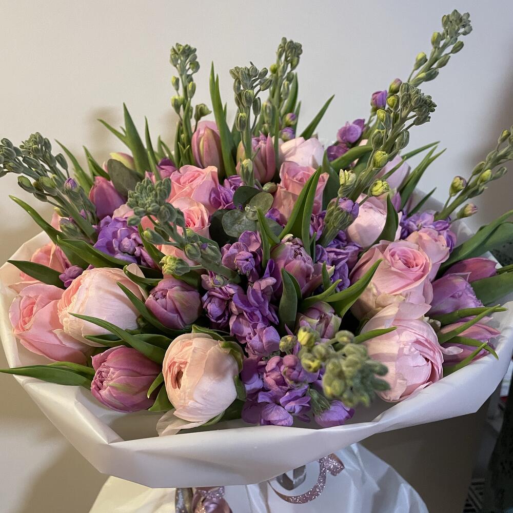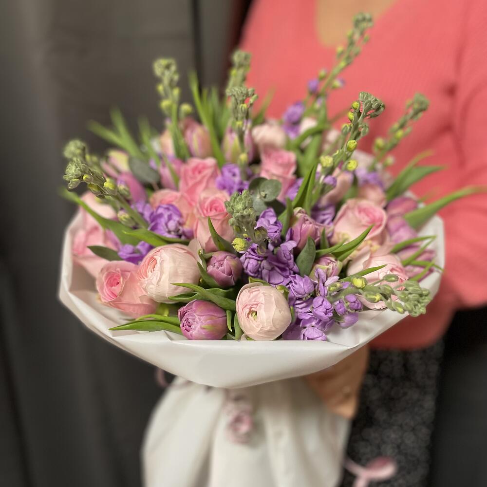 ranunkül Hanoi - 7 adet roses pink - 10 adet matiola lavander - 8 adet tulips lavander - 15 adet