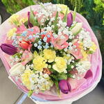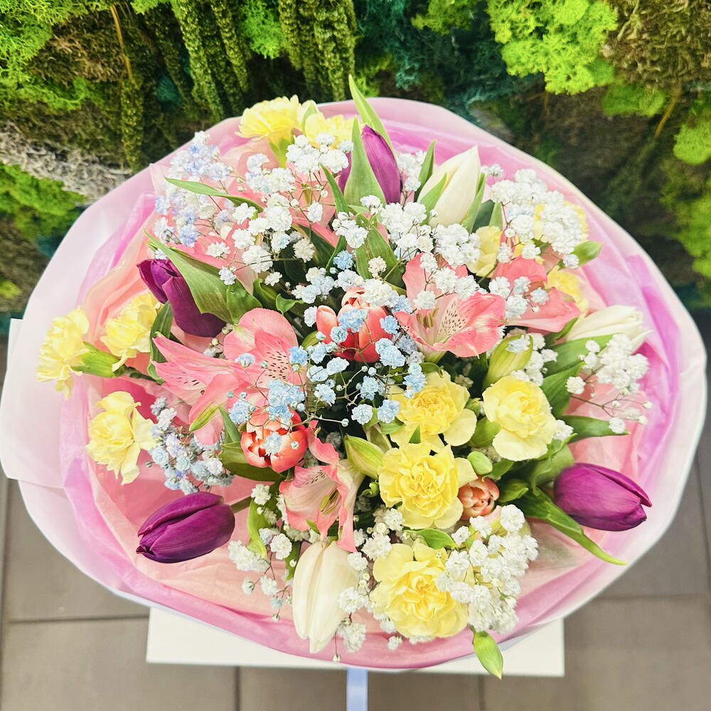 Bu buket, ışık ve sıcaklıkla dolu, baharın narin bir nefesi gibi. Çok renkli laleler, pembe, krem ve güneş sarısı tonlarıyla büyüleyici bir görünüm oluşturarak canlı ve uyumlu bir palet yaratıyor. Hafiflikleri ve doğal güzellikleri, kompozisyona neşeli ve taze bir karakter kazandırıyor. Eterik cipsofilya, narin bir dantel gibi tüm buketi sararak, yaprakları okşayan sabah sisi gibi hafiflik ve romantizm katıyor. Kompozisyonun kalbinde, zarif alstroemeria çiçekleri açıyor; yapraklarında ince bir desen bulunan bu sofistike çiçekler, derinlik ve asil bir dokunuş katıyor. Bu buket, şefkat, renk uyumu ve kelimelere ihtiyaç duymayan bir güzellikle dolu; ilk bakışta büyüleyici ✨
