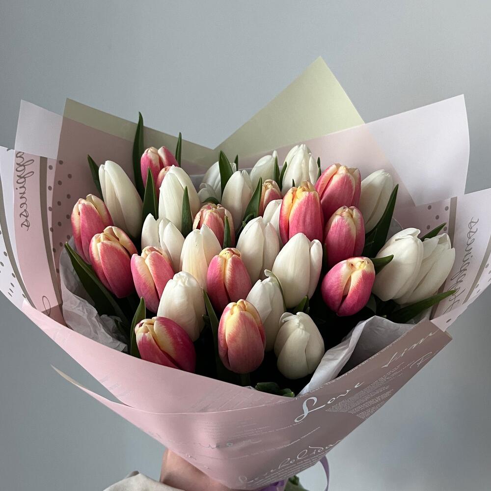 Puokštę sudaro rožinės bei baltos tulpės. Puokštė nuotraukoje yra L dydžio. Įpakavimas įskaičiuotas į puokštės kainą. Galimas puokštės dydis: L- 35 vnt.