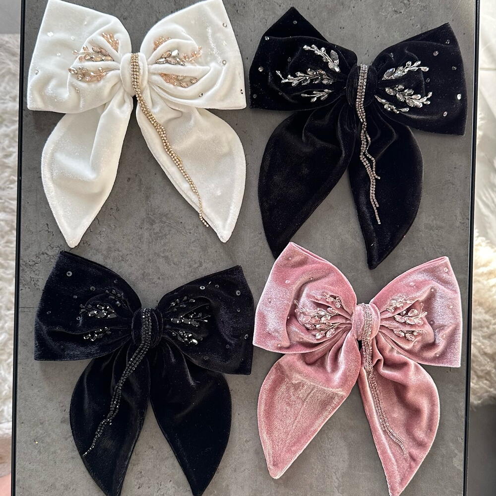 Large Velour Hair Bow with Beaded Embellishment Add a touch of glamour to your hairstyle with this stunning large velvet hair bow. Handcrafted from plush velour,this bow is adorned with intricate beadwork, each bead meticulously sewn by hand to create a unique and sparkling design. The rich texture of the velour combined with the detailed beaded embellishments makes this hair accessory a perfect statement piece for any occasion, whether it’s a special event or a stylish everyday look. Each bow is individual and one-of-a-kind, go to the profile and see in other colors.
